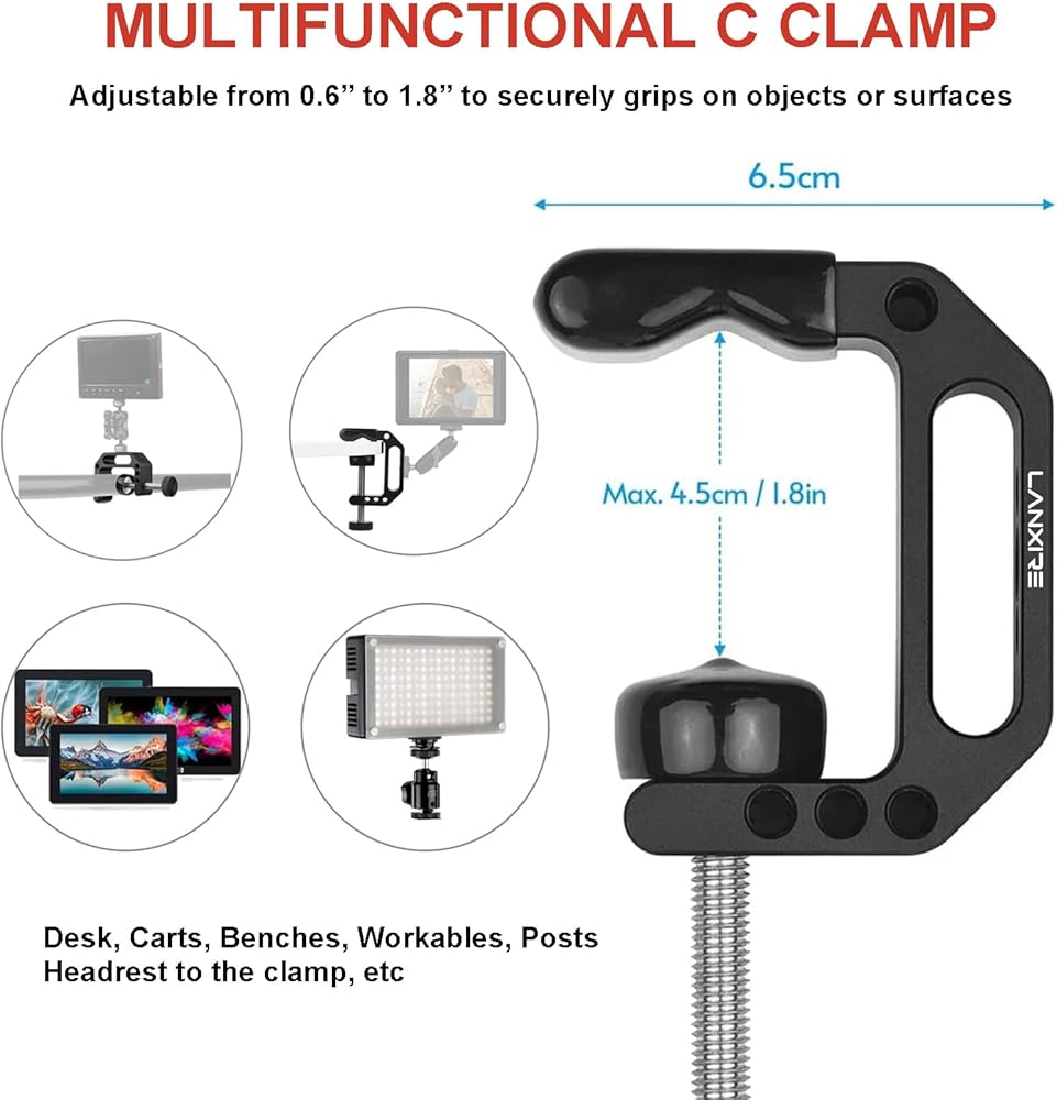 【متين ومتين】 مصنوع من سبائك الألومنيوم عالية الجودة والفولاذ المقاوم للصدأ، هذا المشبك c متين وقوي للغاية. يتراوح نطاق فتح فك المشابك من 1 مم إلى 45 مم، مما يسمح لك بتركيب أشياء بسمك أقل من 45 مم.
