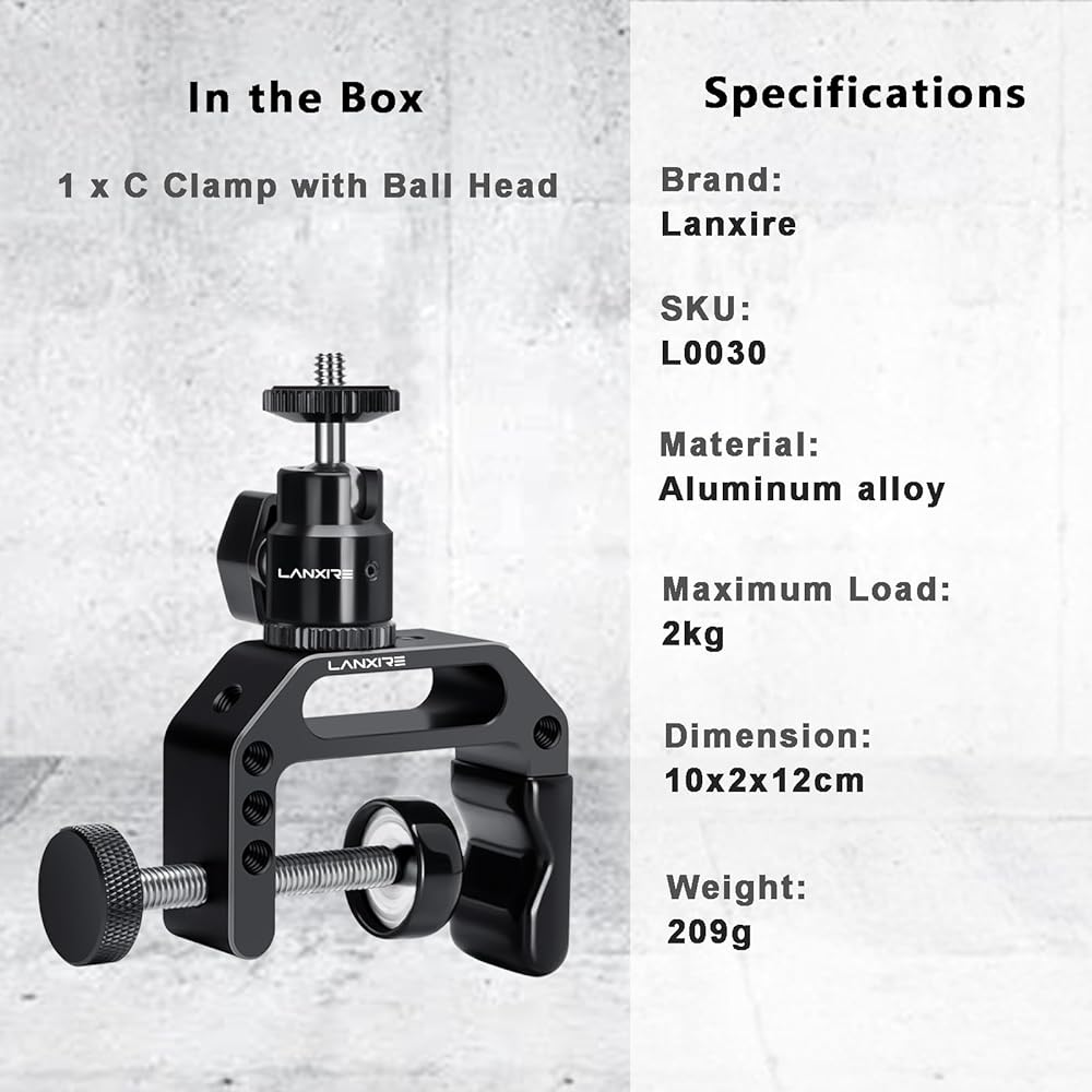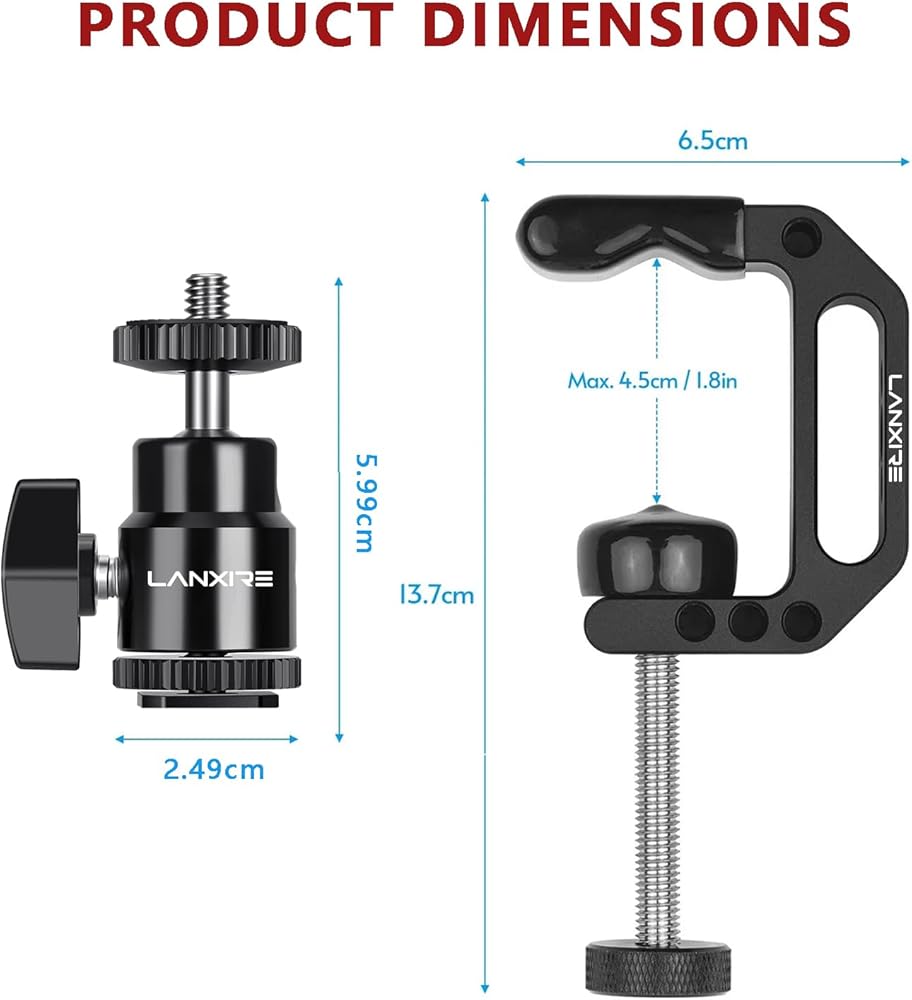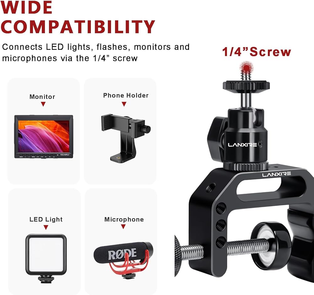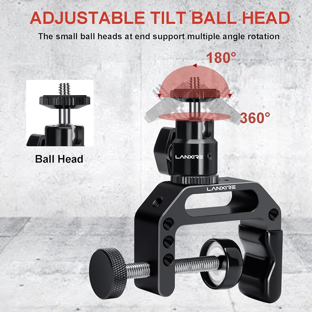 حامل كاميرا بمشبك C مع محول رأس كرة صغيرة - برغي 1/4 بوصة - فتحات مترابطة 1/4 بوصة و3/8 بوصة - للكاميرا، Gopro، Insta360، ضوء الفلاش، الشاشة، الميكروفون
