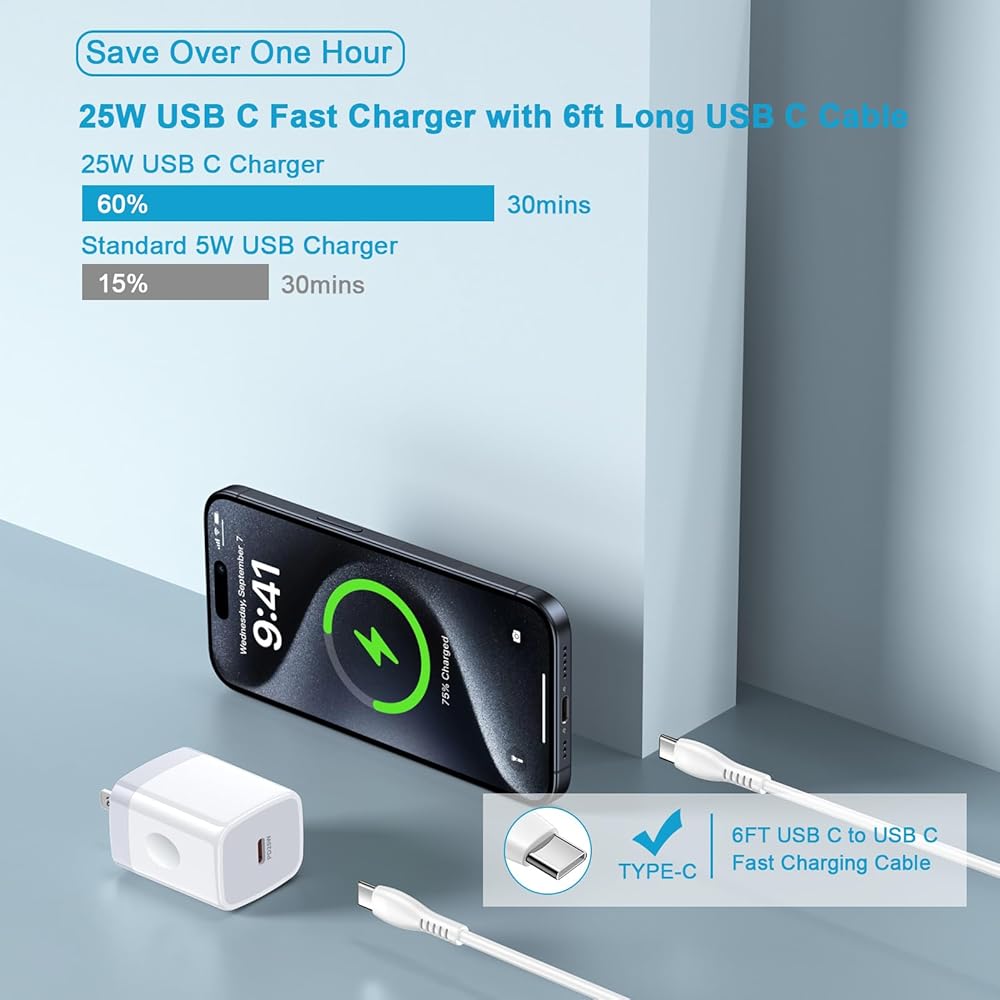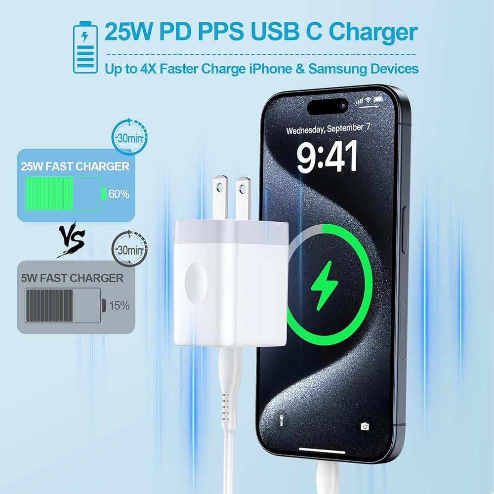 • 【25W USB C Fast Charger Adapter】: This usb c charger fast charger block provides you Max 25W output power to fast charging your phone. The iPhone charger wall plug supports PPS/PD 3.0/QC 4.0 fast charging protocols, providing super-fast charging for most USB-C devices. After testing, this Samsung fast charger adapter can charge the Samsung Galaxy S24/S23/S22/S21 series up to 60% from 0% in just 30 minutes, and fully charge an iPhone 16/15 in about 1 hour - a remarkable 75% faster than standard chargers.
