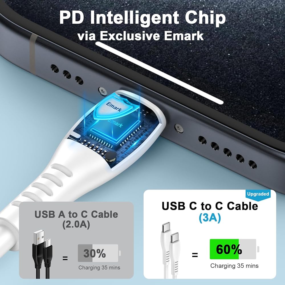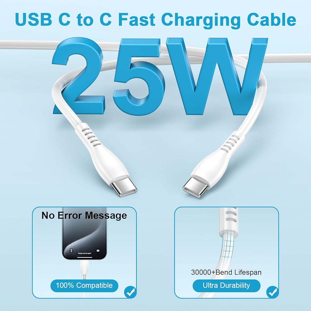 • 【25W Type C Charging Cable】: The iPhone 16 USB c charger cable fast charging the maximum output up to 20V/3A power output fast charging and up to 480 Mbps data transfer speeds. usb c to usb c charger cable offering a user-friendly reversible design, it also contained 56k ohm resistor to protect your device from high current danger and ensure safe charging, S24 ultra type c fast charging cord has been strictly tested, including 30000+ bending test, 20000+ repeated unplugging test, load-bearing test etc, Samsung A35 5g fast charger which can withstand daily wear and tear.