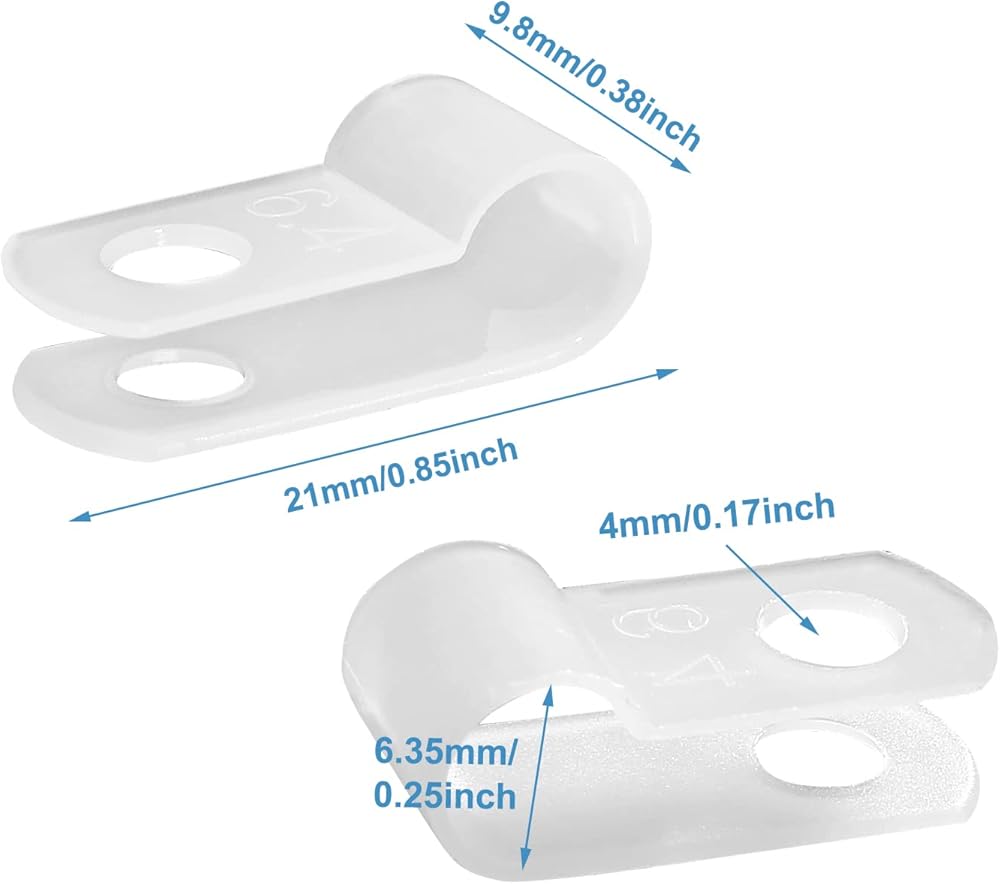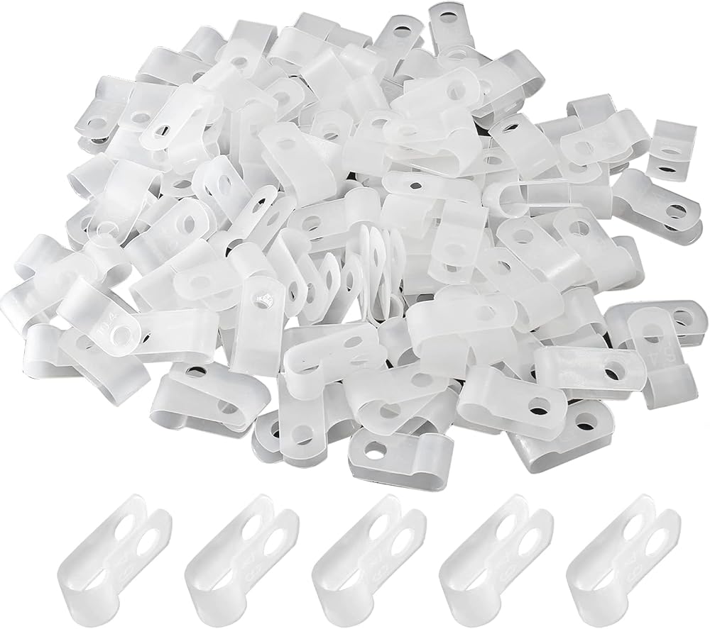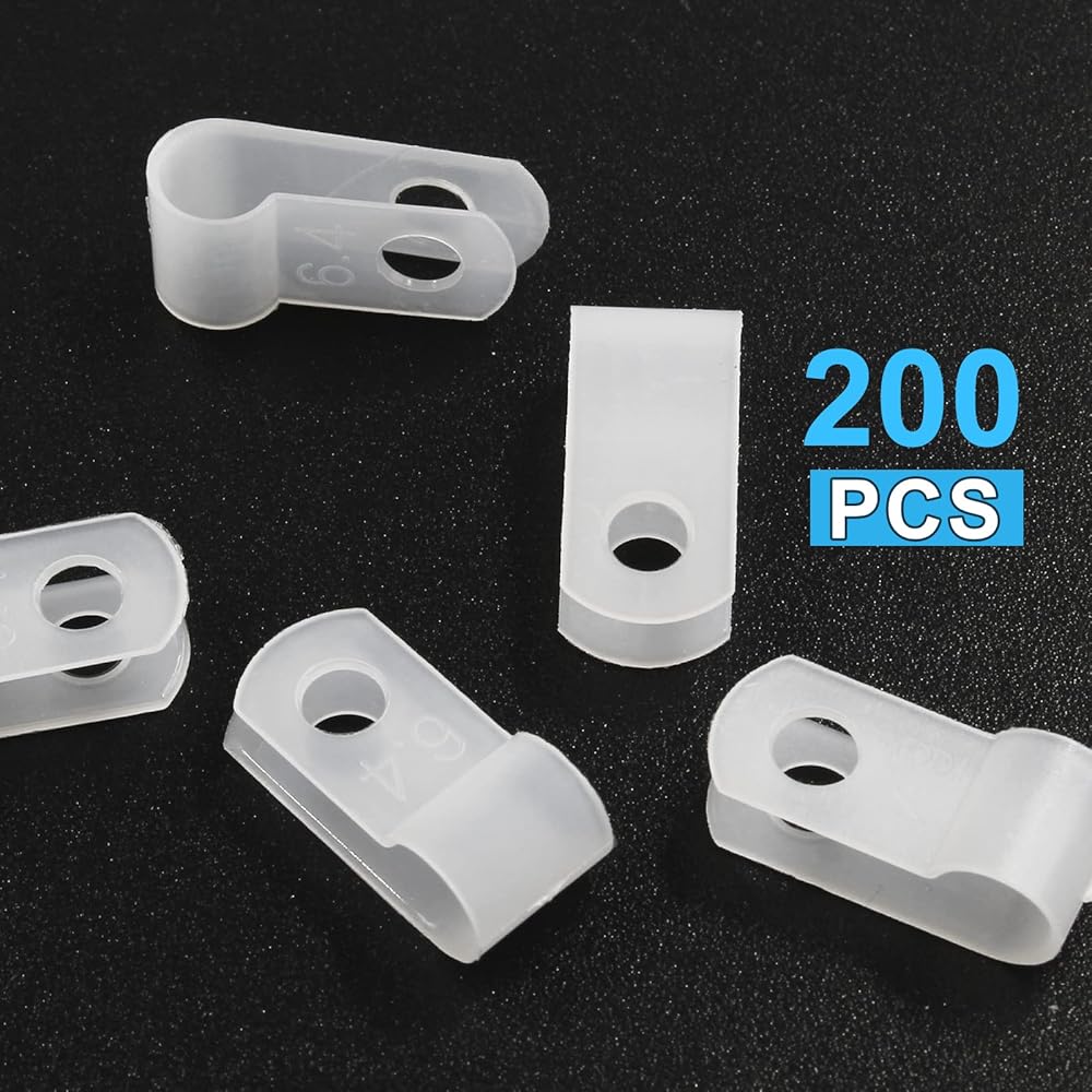 Package & Size: 200Pcs white r-type nylon cable clamps for 1/4 inch (6.4 mm) diameter wire rope management, 4mm/ 0.17inch hole diameter, mounting screws not included.