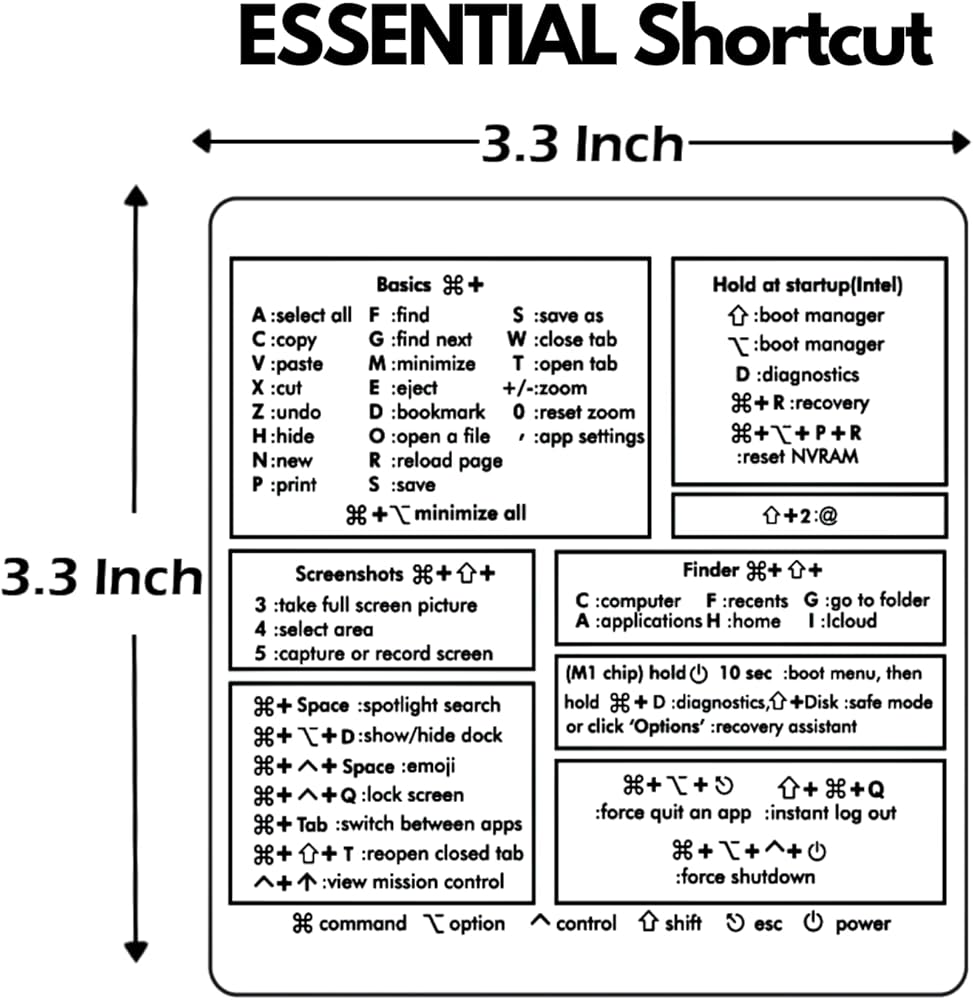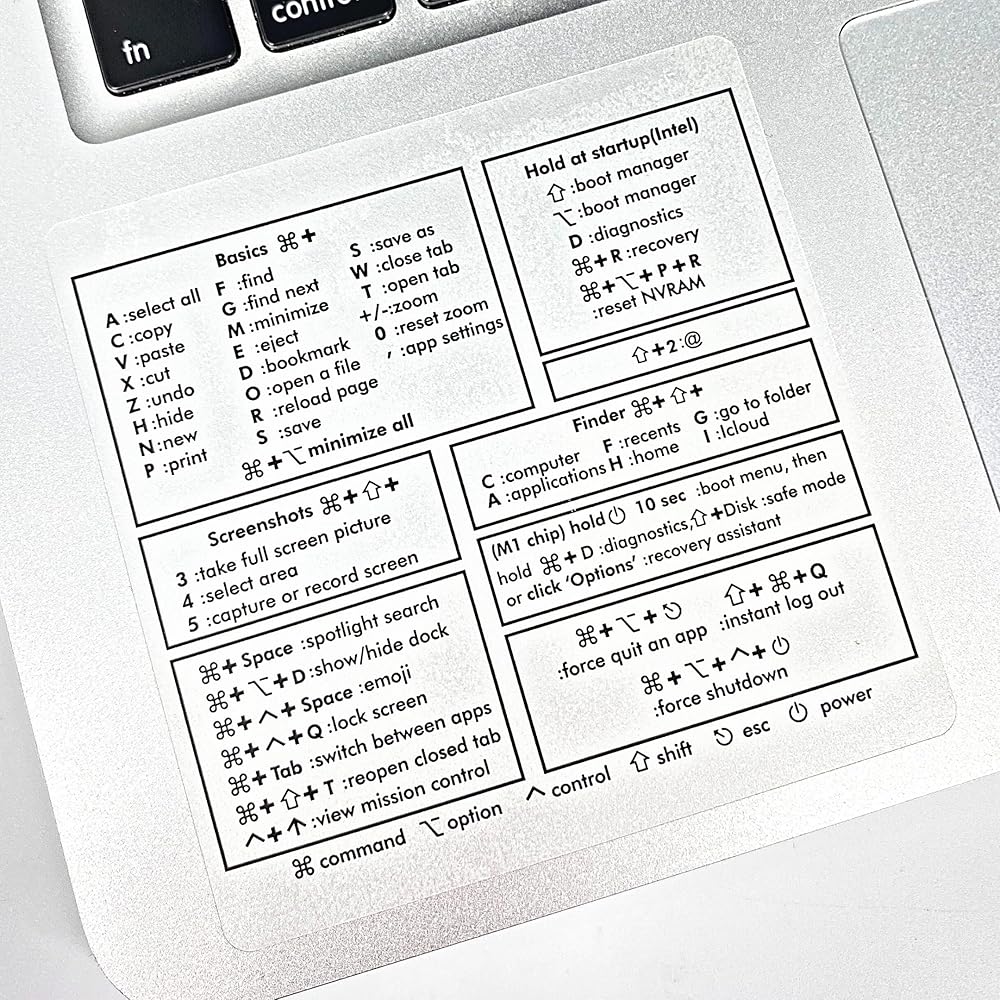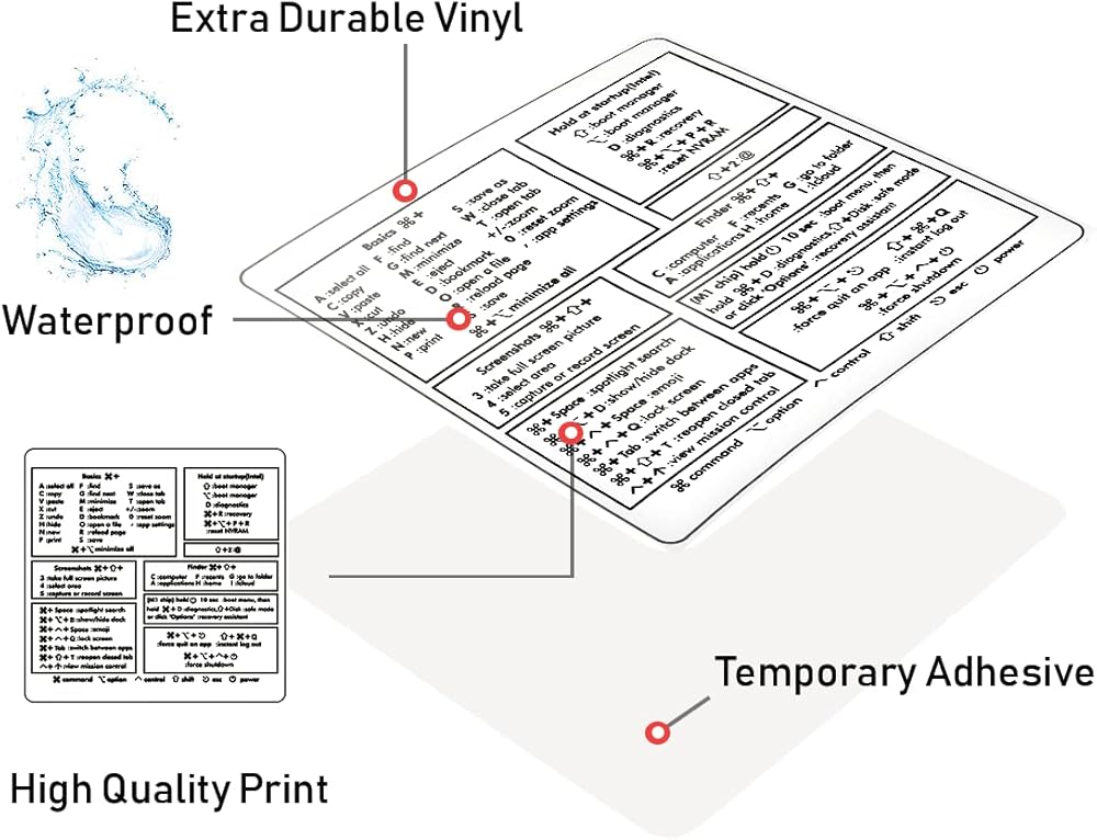 EL NIDO DESIGN MacBook keyboard sticker is an accurate, comprehensive list of keyboard shortcuts that you need. Our Mac keyboard stickers are made up of high-quality vinyl material. These laptop stickers are clear, durable, waterproof, and scratchproof. Our MacBook air keyboard stickers contain a list of shortcuts for any Mac OS, including Big Sur, and fit easily on the bottom corner of your MacBook so you can quickly look down and read it. Features that we love; ✔ Removable ✔ Waterproof ✔ Simple to Install ✔ Best Quality Vinyl ✔ No-Residue Adhesive ✔ Easy to Clean & Stick PERFECT FOR LEARNING YOUR MACBOOK: If you have a new MacBook and want to learn how to use it like a pro, these computer stickers are for you! You'll have the shortcuts right in front of you, so you can learn and memorize them without having to look them up or print them out. The computer stickers for mac are not permanent and easy to remove. EVERY ESSENTIAL SHORTCUT: With this Mac Book air sticker, you have the most important shortcuts placed right in front of you. Easily learn new shortcuts and always be able to quickly lookup commands without the need to “Google” it. STICKER APPLICATION: These MacBook keyboard stickers are easy to apply and easy to remove. They will not damage the surface. Our mac stickers for laptop is perfect for all major operating systems and applications including Mac OS, as well as Big Sur, Catalina, Mojave, and more