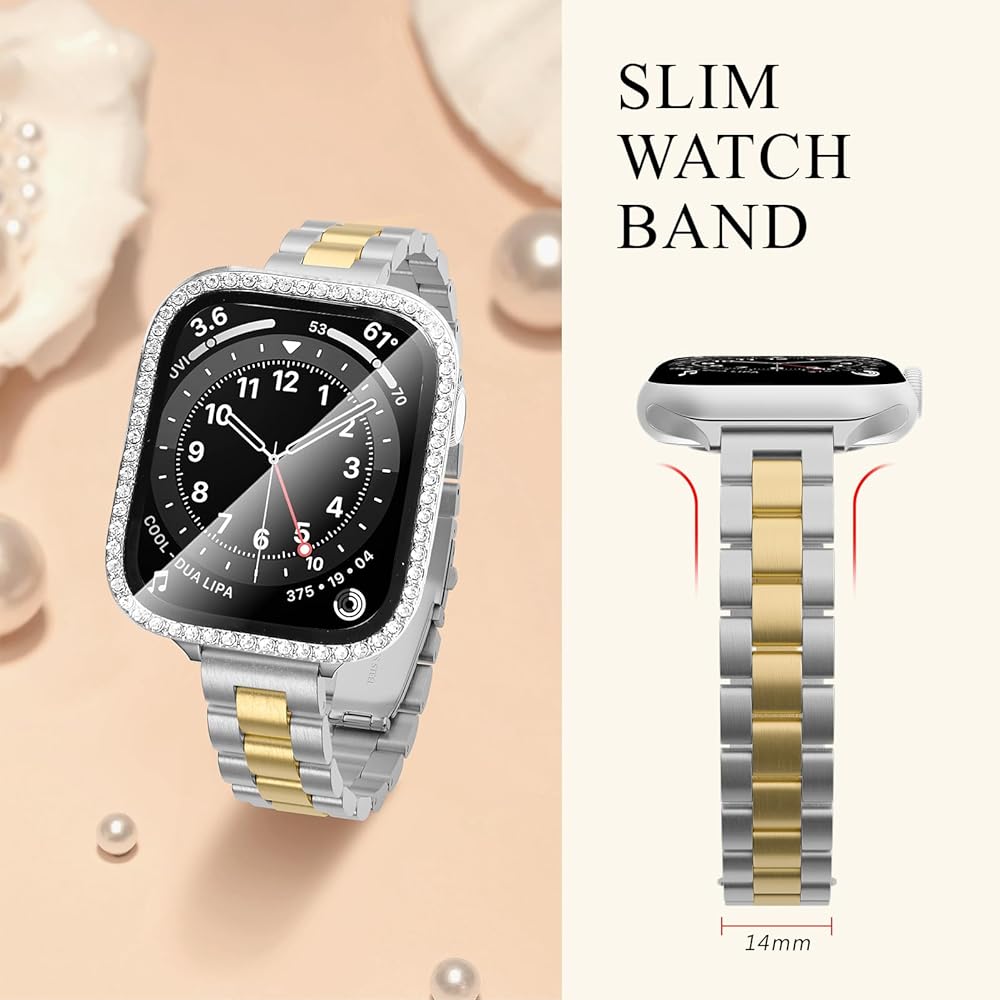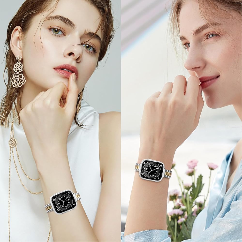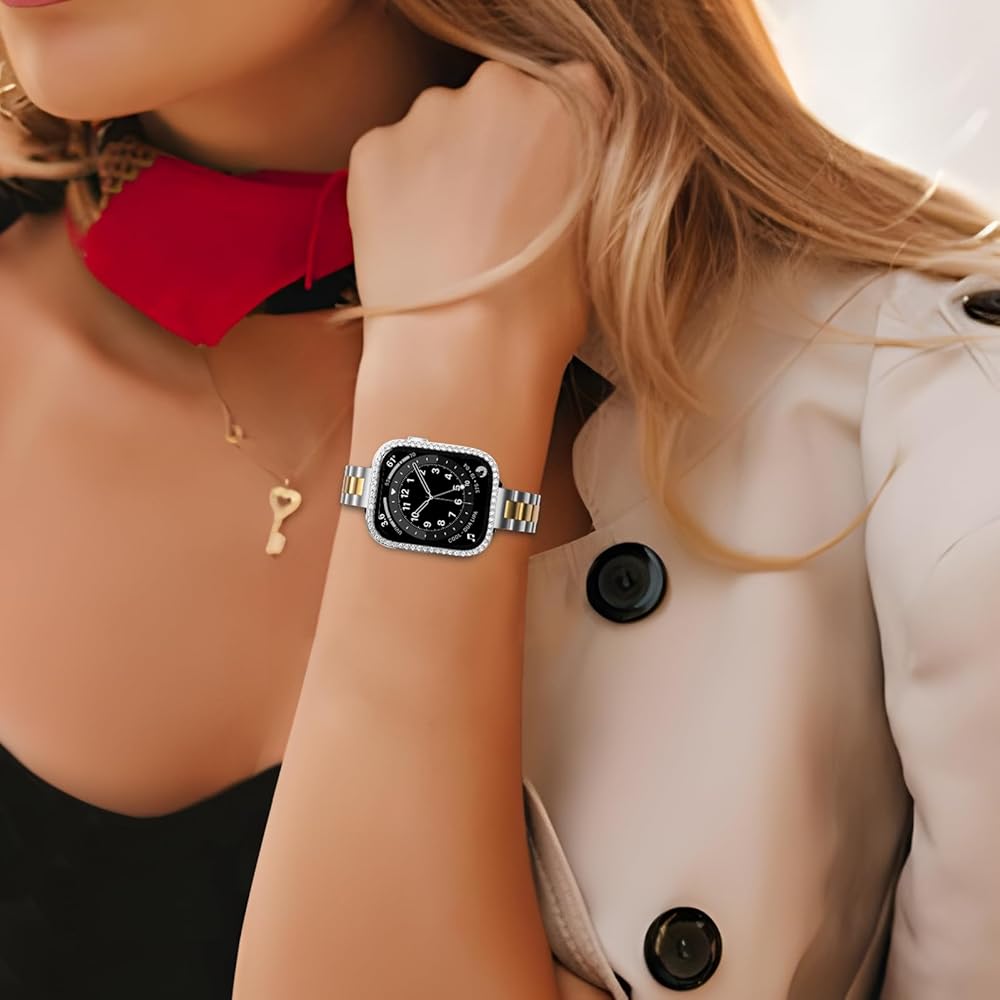 【جراب لامع】 أساور ساعة أبل للنساء من Burloreme مع حافظة واقية للشاشة من الزجاج المقسى، مما يضمن شفافية عالية وحساسية اللمس.