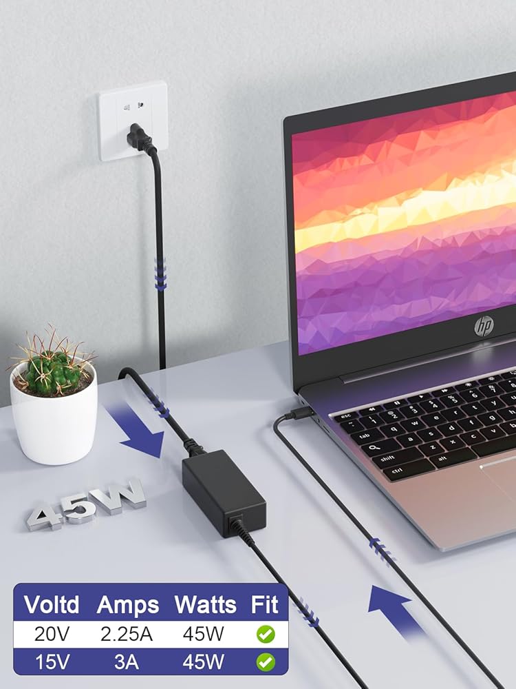 شاحن كمبيوتر محمول USB من النوع C بقوة 45 وات لجهاز HP Lenovo ThinkPad Yoga وDell Latitude Acer Google Asus Samsung School، بديل لمحول التيار المتردد Hp Chromebook X360 14 14A 11 13 Elite X2