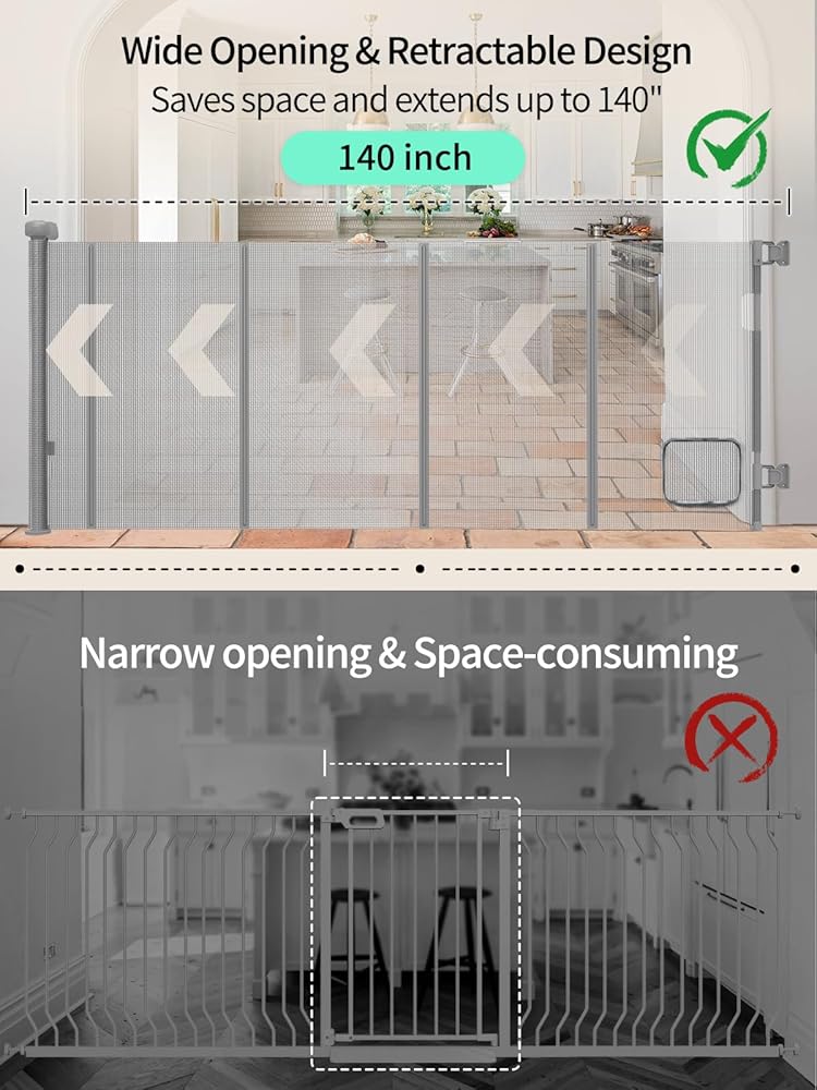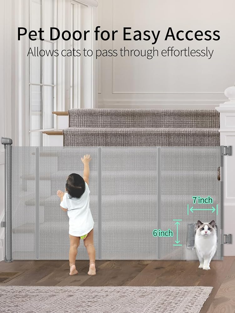 بوابات أطفال قابلة للسحب، بوابة للحيوانات الأليفة مع باب للقطط - معززة بالألياف الزجاجية، عرض 140 بوصة، طول 33 بوصة، بوابة أطفال شبكية مع باب مثالي للمداخل والممرات، إعداد سهل للاستخدام الداخلي والخارجي (رمادي)