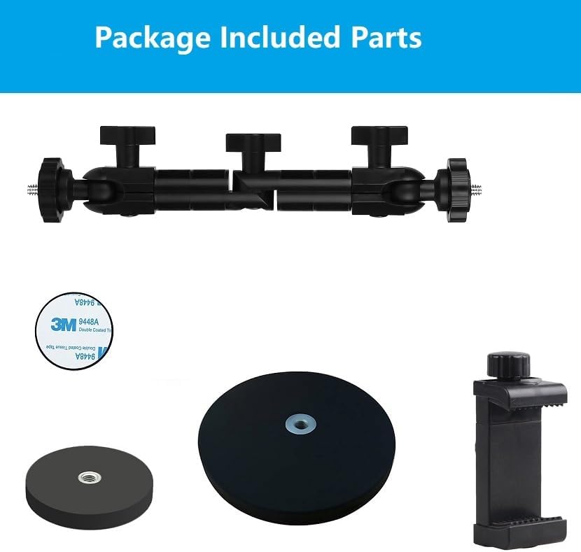 ما تحصل عليه: 1x مصاصة مغناطيسية مزدوجة مع ذراع دوارة؛ 1x لوحة حديدية مستديرة بمادة لاصقة؛ 1x حامل هاتف عالمي مع فتحة لولبية (يمكن استخدامه بدون مصاصة الهاتف)؛