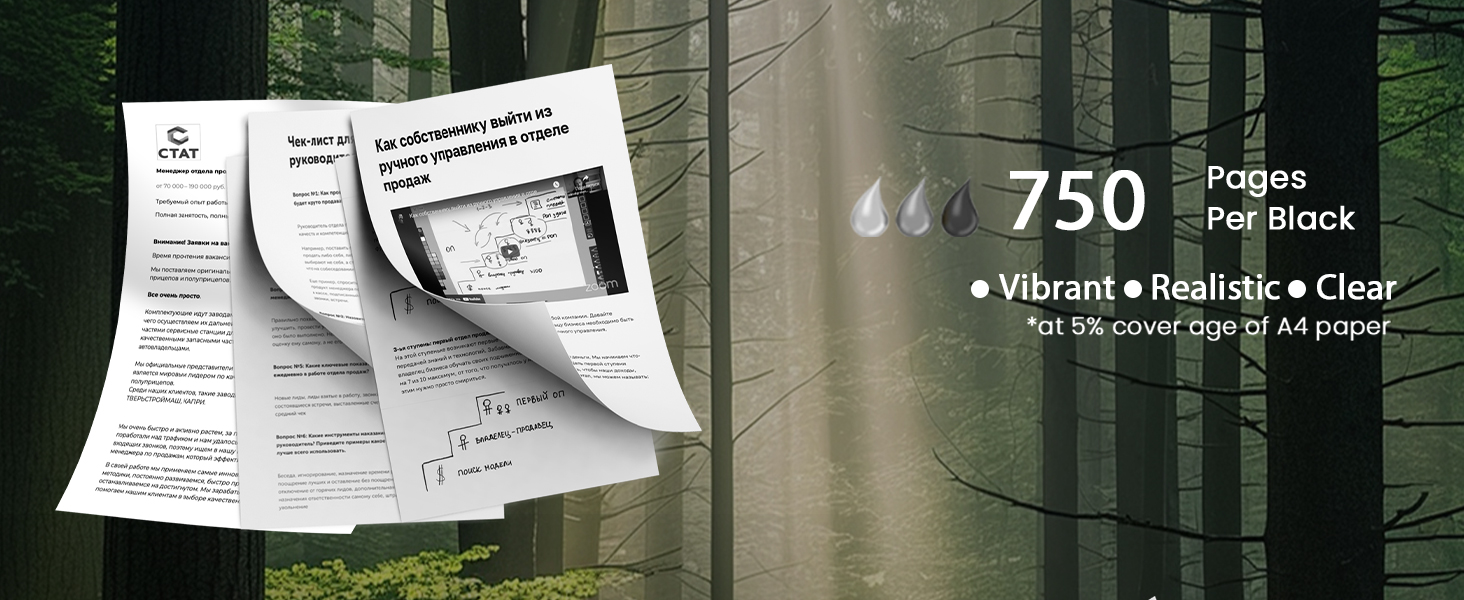 • إنتاجية الصفحة: ما يصل إلى 750 صفحة لكل حبر 67 أسود (بتغطية 5%)