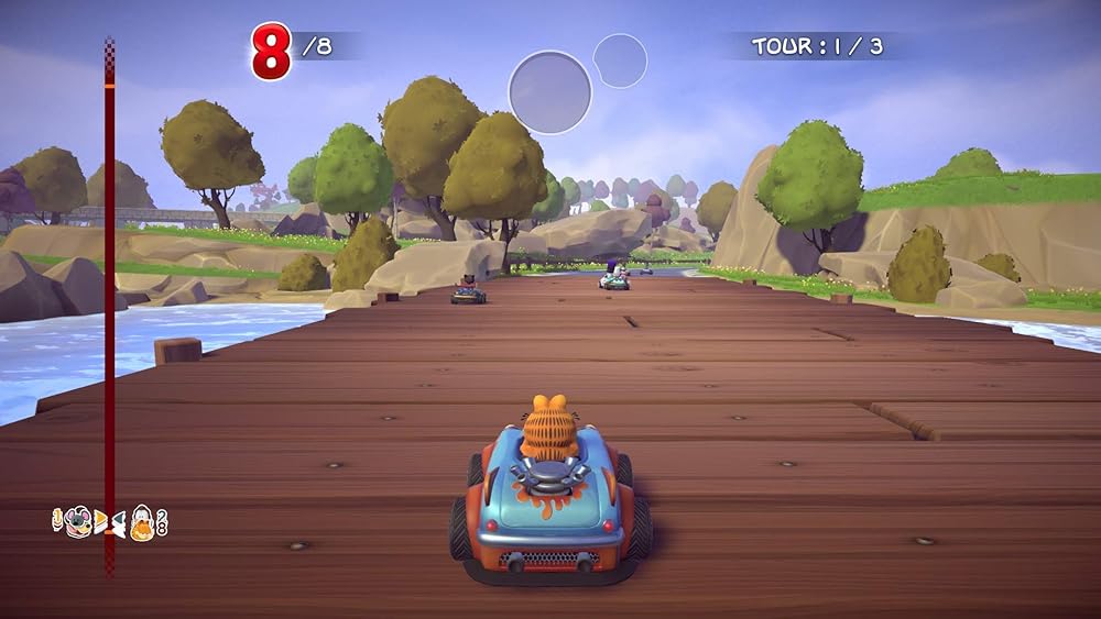8 CHARACTERS: Garfield, Odie, Jon, Nermal, Arlene, Liz, Harry and Squeak9 ATTACK AND DEFENSE BONUSES to turn the race aroundCUSTOMISE your character and kart with dozens of accessories