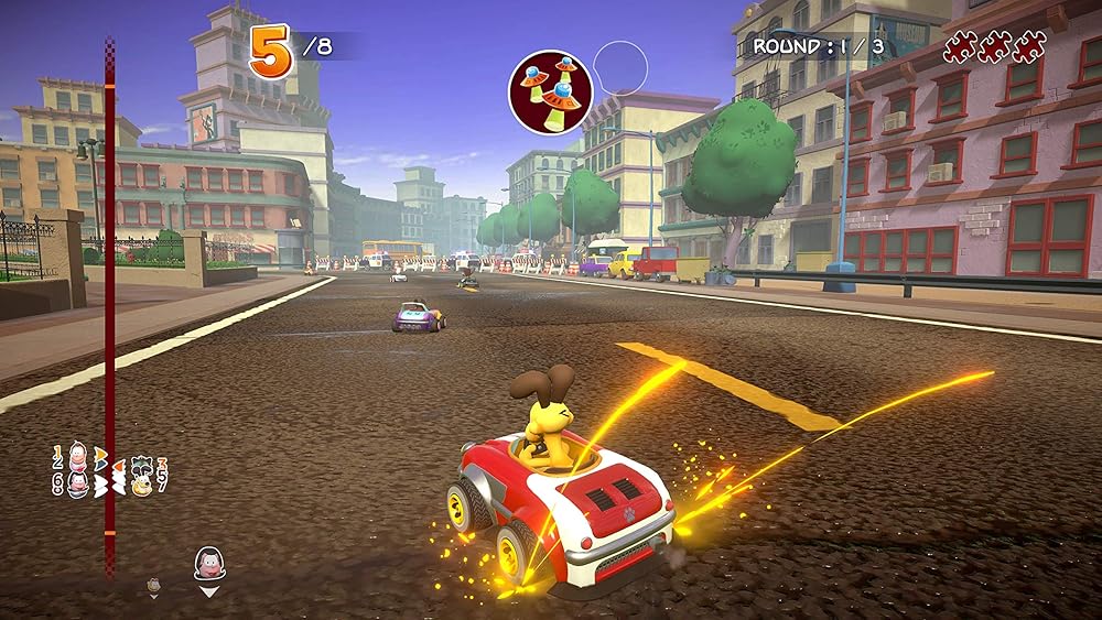 Garfield, the famous lasagna-loving cat is back to take on Jon, Odie and company in a no-holds-barred racing game! Choose your character and kart according to their characteristics and your driving style, get off the starting line first and control skids to outrun your opponents. Use crazy bonus objects, like the Pillow or the Magic Wand, to gain an edge and get over the finishing line first. Are you lazy like Garfield? Take shortcuts to overtake the other racers with the Spring! Race your friends in local mode or online, with up to eight players on 16 iconic circuits from the world of Garfield. 3 GAME MODES: Grand Prix, Single Race, Time Trial MULTIPLAYER up to 4 players in split-screen mode and up to 8 players in online mode or in portable mode on Nintendo Switch 16 CIRCUITS: Crazy races in stunning environments inspired by the world of Garfield, such as Palerock Lake and Pastacosi Factory 8 CHARACTERS: Garfield, Odie, Jon, Nermal, Arlene, Liz, Harry and Squeak 9 ATTACK AND DEFENSE BONUSES to turn the race around CUSTOMISE your character and kart with dozens of accessories