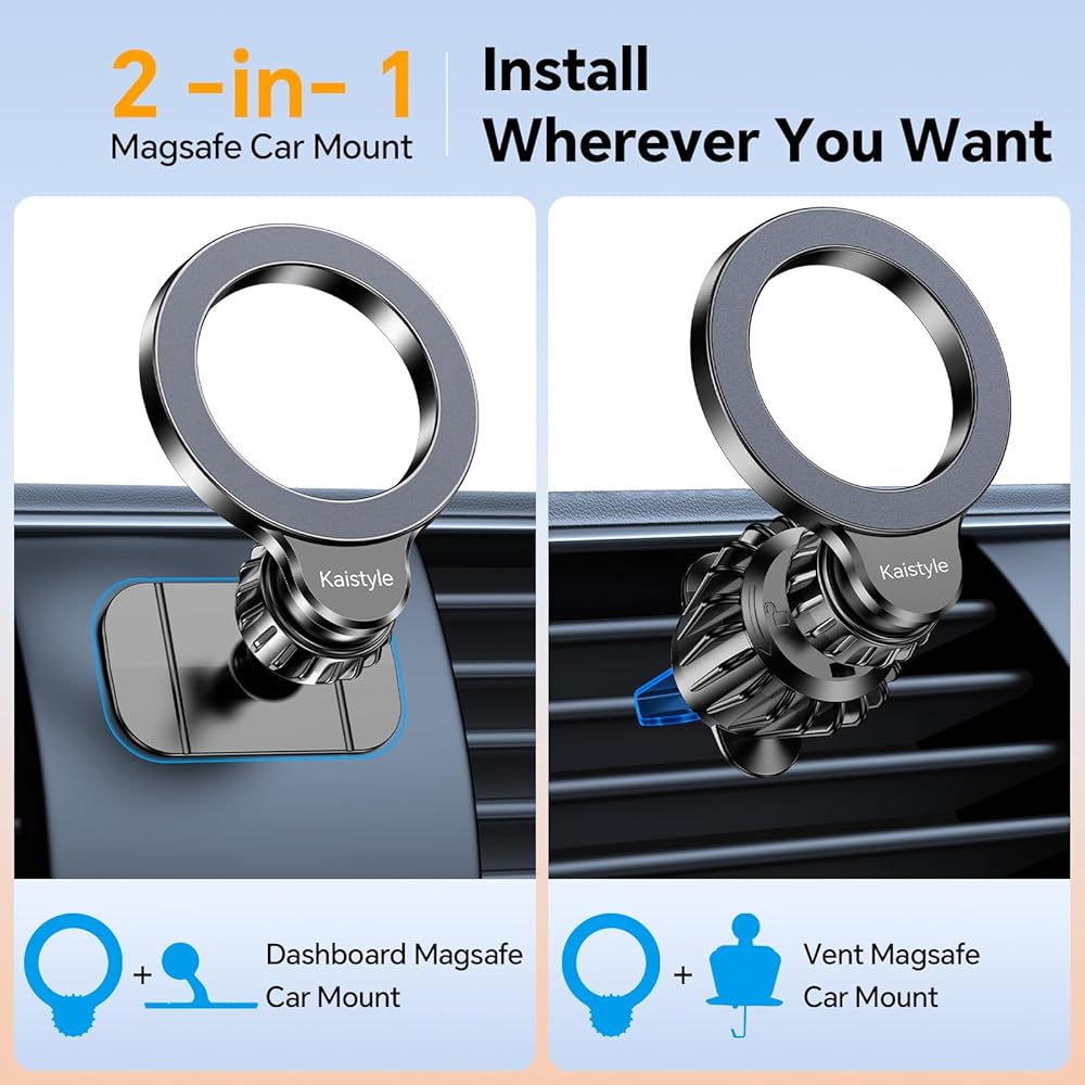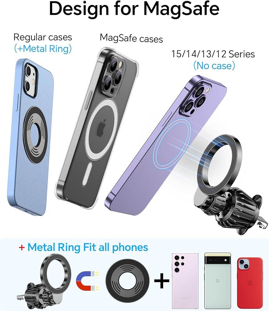👍الشمولية👍يناسب حامل السيارة MagSafe هذا جميع السيارات والشاحنات الصغيرة وسيارات الدفع الرباعي وسيارات الأجرة الأخرى ويتوافق مع هواتف iPhone 15 و14 و13 و21 وPro وMax/Plus/Mini. يمكن أيضًا استخدام هواتف Android أو الهواتف/الحافظات التي لا تحتوي على ميزة الأمان المغناطيسي: سوف نقدم حلقات معدنية مطابقة.