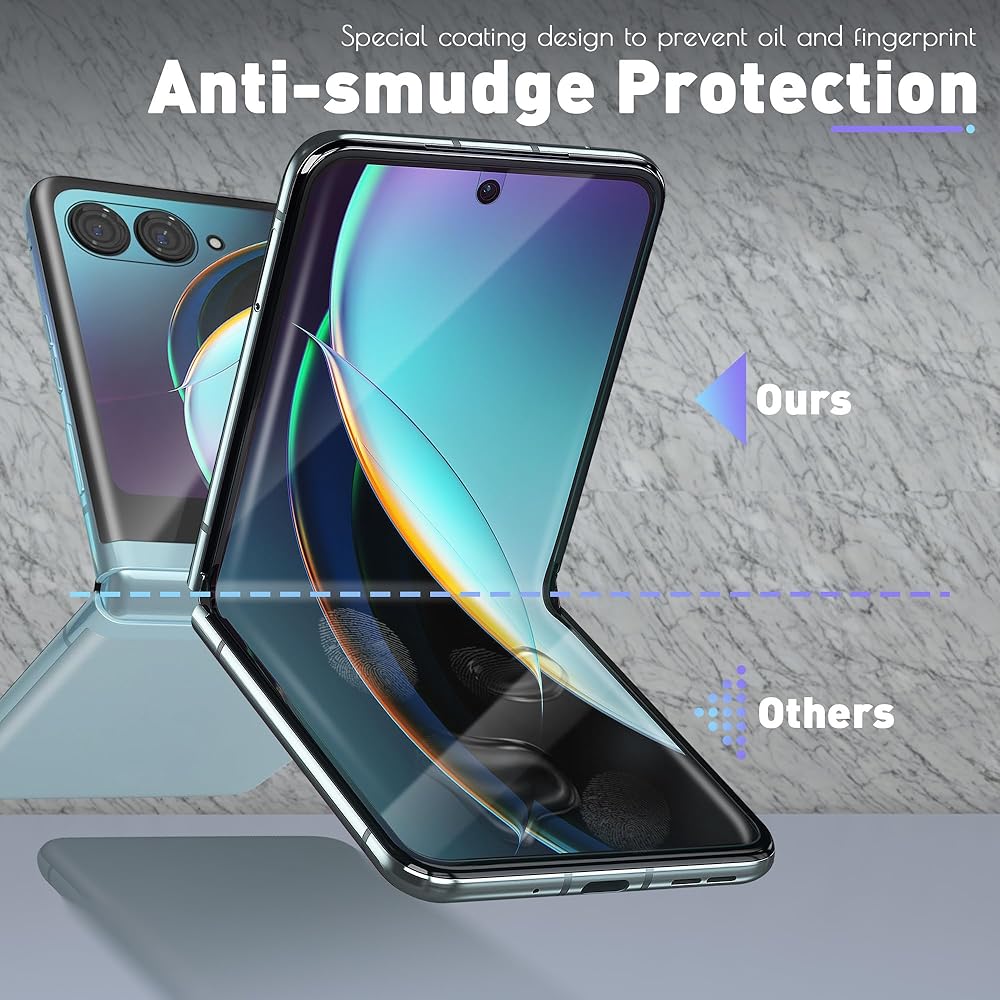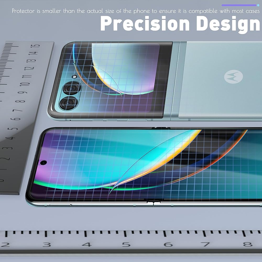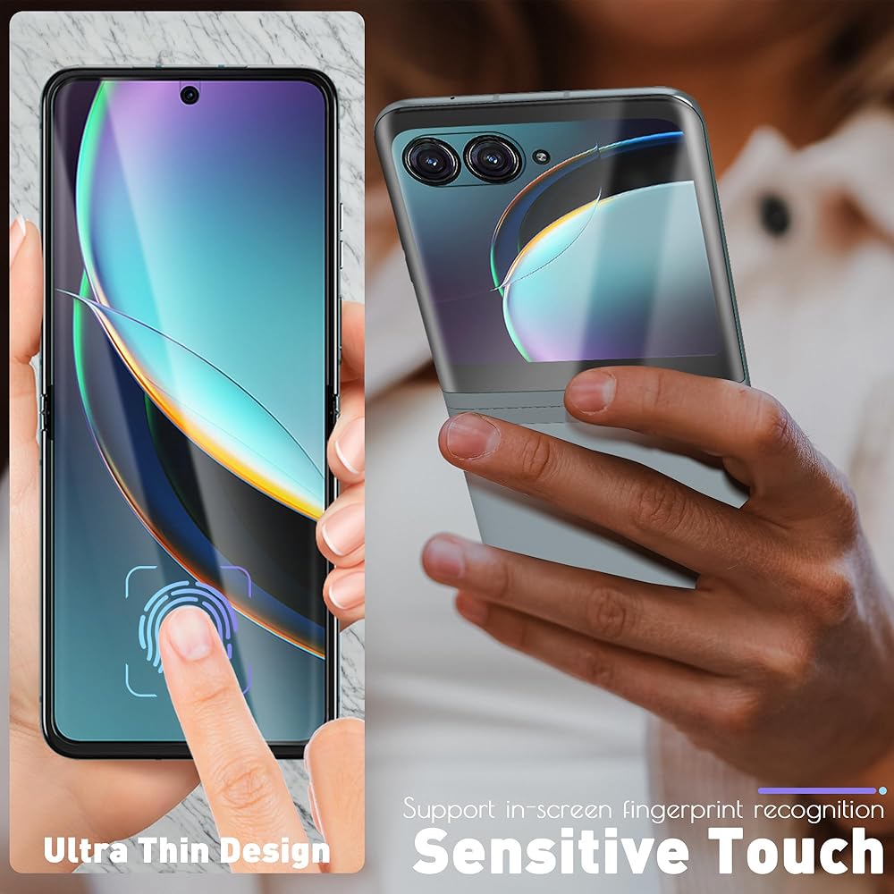 【حماية كاملة】يتم استخدام 3 قطع من الغشاء بأكمله للشاشة الأمامية، و3 قطع للشاشة الخلفية. مناسب تمامًا لهاتف Motorola Razr + / Motorola Razr Plus 2023. نحيف للغاية: 0.15 مم، يمكن تعديله لمنع الرفع بأي حافظة.