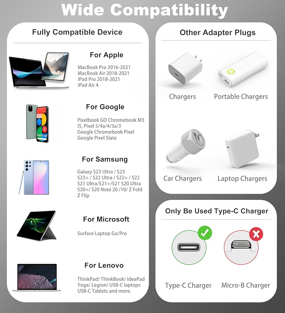 【توافق واسع】 كابل شحن USB C بقدرة 60 وات USB C متوافق مع iPhone 15 15 Pro/15 Pro Max Samsung Galaxy S24 S24+ S23 FE S23 S23+ S22 Ultra/Plus، Z Flip، Z Fold، A15 A23 A34 A54 Note 20، Google Pixel 8 7 7a Pro، Nexus 6P 5X، Motorola Razr edge، iPad Pro mini، Galaxy Tab A9 A8 A7 S9 S8 MacBook، MacBook Pro، Google Chrome. متوافق أيضًا مع المزيد من أجهزة الكمبيوتر المحمولة وأجهزة التحكم في الألعاب والكاميرات والطائرات بدون طيار.