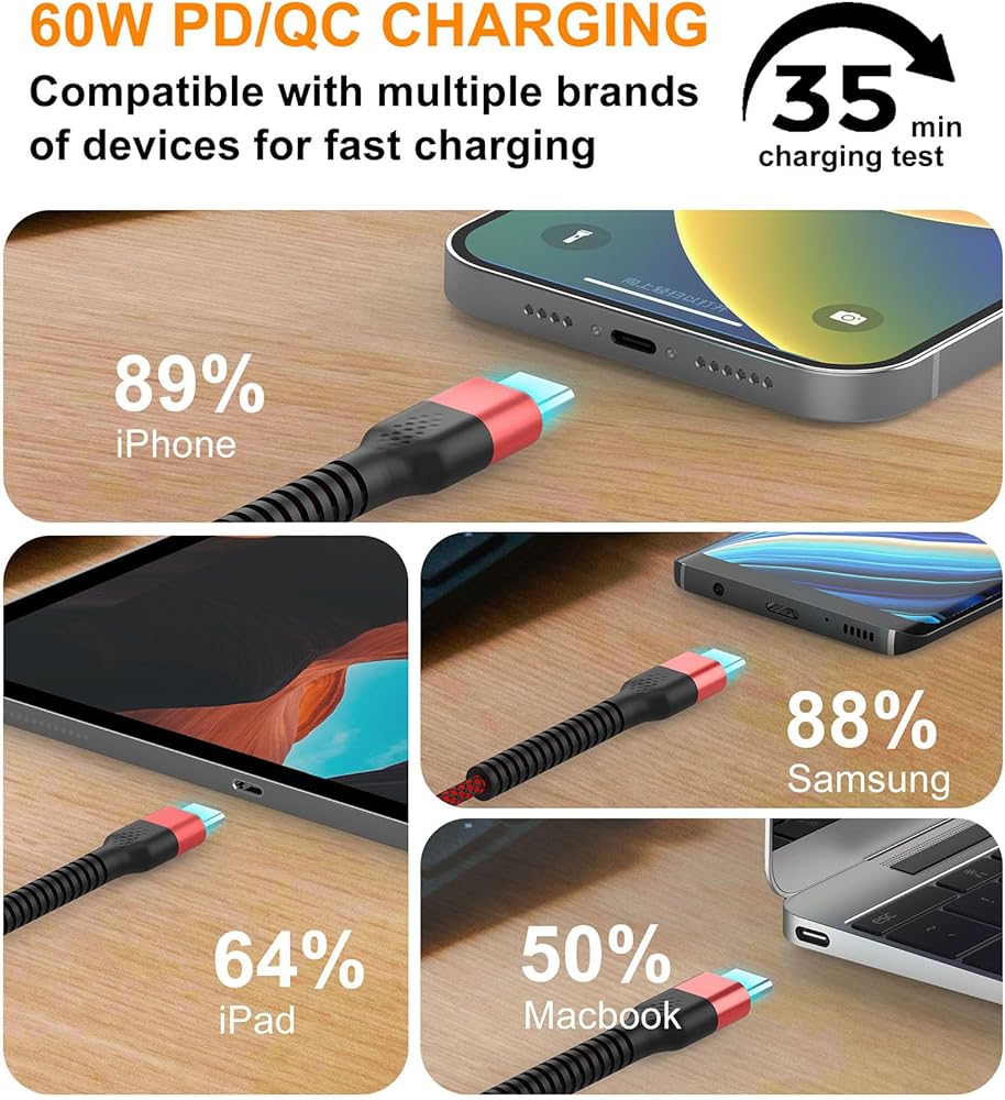 【شحن سريع 60 وات】 يضمن السلك النحاسي المجدول ذو 5 نوى سرعة عالية، وتقليل فقدان المقاومة الداخلية، والتوصيل القوي، ويدعم الشحن السريع PD وQC. طاقة الإخراج تصل إلى 20 فولت 3 أمبير، مناسبة لمحولات USB C مثل 18 وات/30 وات/45 وات/60 وات، الشحن السريع 60 وات يسمح لك بشحن الجهاز إلى 75% في 30 دقيقة، وسرعة نقل البيانات تصل إلى 480 ميجابت في الثانية/ ق. (ملاحظة: هذا المنتج لا يدعم إخراج الفيديو)
