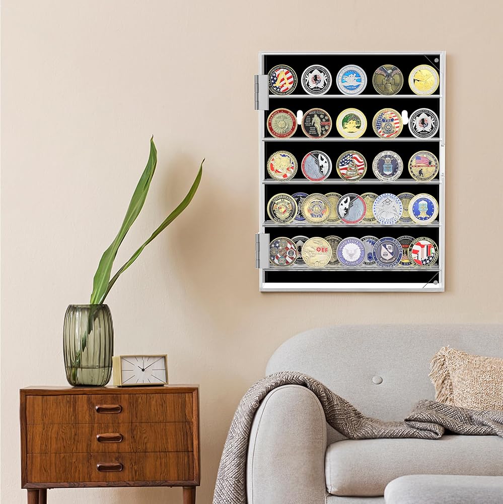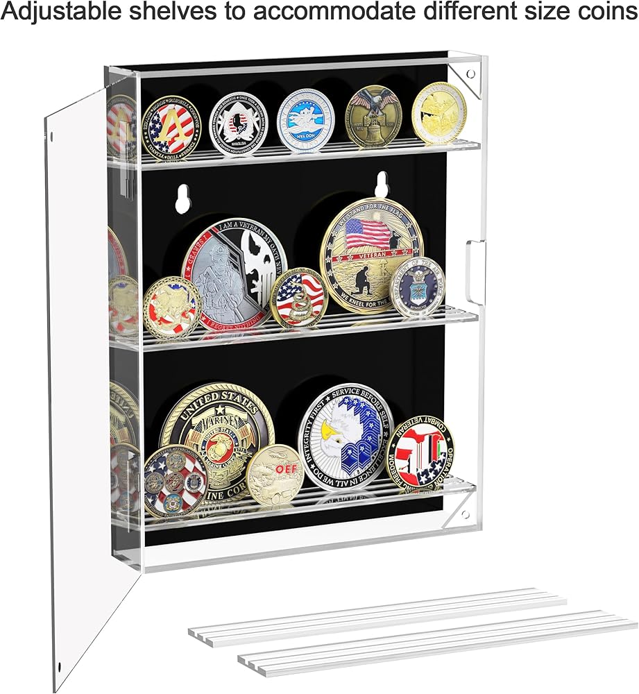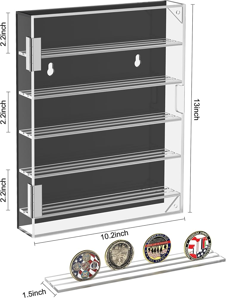 Large Capacity Storage: The acrylic coin display case includes four removable shelves capable of holding up to 60 standard-size challenge coins. The slotted shelves are removable to accommodate coins of different diameters and prevent the coins from sliding.