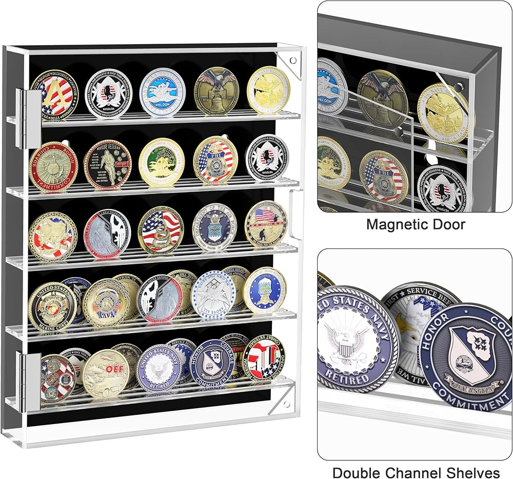 حافظة عرض العملات المعدنية من HBlife Military Challenge، حامل عملات معدنية من الأكريليك الشفاف، حامل عرض للعملات المعدنية مثبت على الحائط مع رف قابل للإزالة وباب مغناطيسي، صندوق الظل يناسب الميدالية والشارة