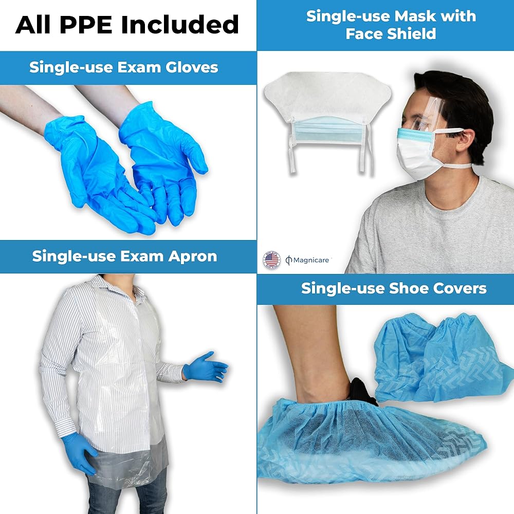 Ideal Bodily Fluid Clean Up Kit for Immediate Response: Equipped with disposable gloves, masks with face shields, shoe covers, and aprons, alongside a scraper and biohazard bags, our spill kit provides effective tools for a rapid and safe clean-up process with no direct contact with the liquid spill.