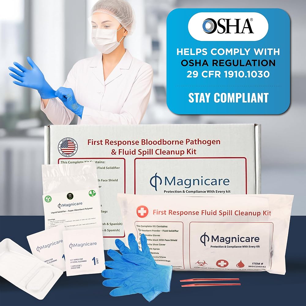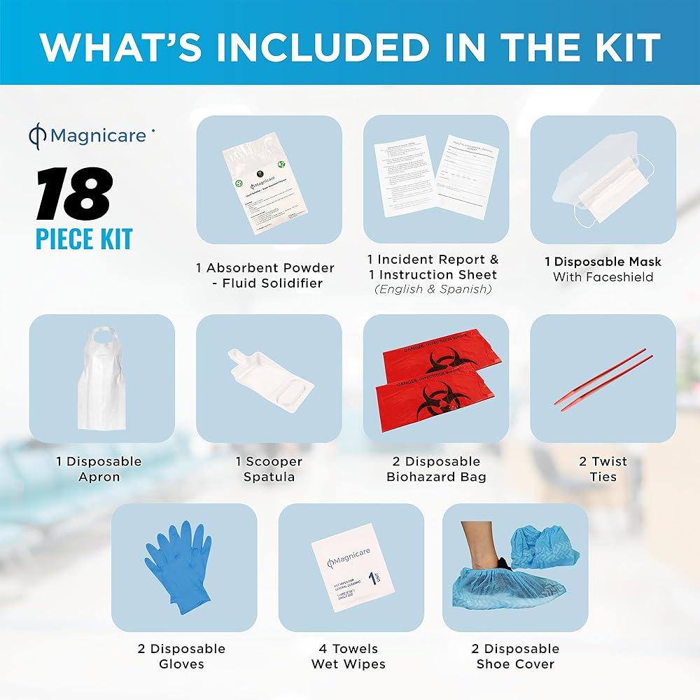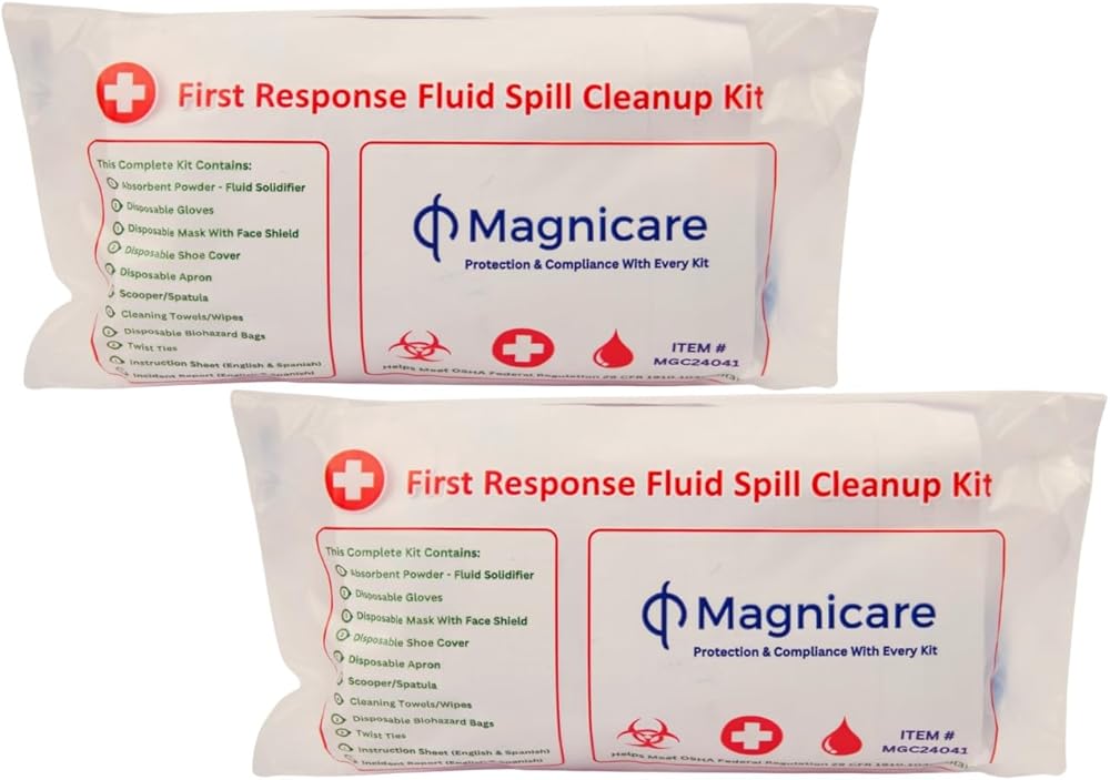 First Response Spill Kit IN A BAG The enhanced First Response Spill Kit is expertly designed for the comprehensive management of bodily fluid spills, making it a critical asset for ensuring workplace safety and compliance with OSHA Regulation 29 CFR 1910.1030(d)(3)(i). This kit is equipped with high-quality, disposable tools and personal protective equipment, including absorbent powder, gloves, masks with face shields, shoe covers, aprons, and a scraper, along with clean-up towels (wipes) for thorough cleanups which helps avoid any direct contact with the fluid spill. It features a disposable biohazard bag with twist ties for safe waste containment. The bloodborne pathogen kit includes bilingual instructions in English and Spanish, ensuring accessibility and ease of use across diverse workforces. An incident report form is provided to document spills accurately, enhancing safety protocols. Ideal for a wide range of settings such as restaurants, schools, and public areas, this kit is the ultimate solution for maintaining cleanliness and health standards making it an ideal bodily fluid clean up kit.