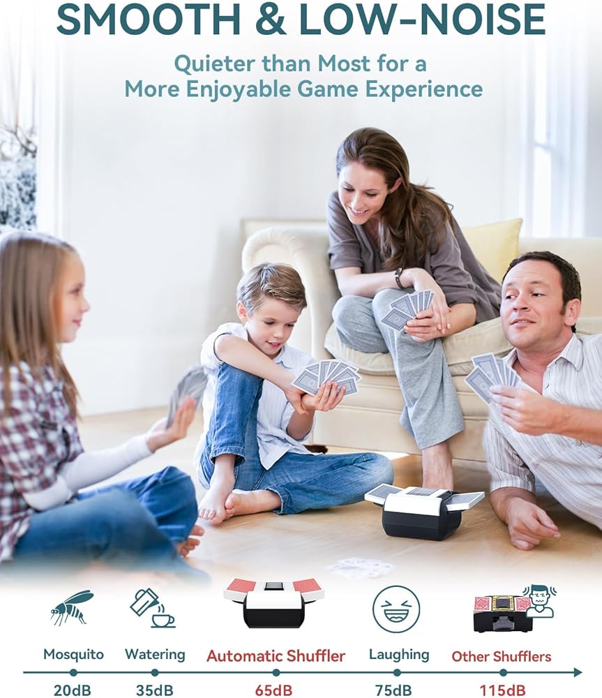[تبديل منخفض الضوضاء] - تم تصميمها للعمل بهدوء أكثر من غيرها، تضمن آلة الخلط بيئة ألعاب خالية من التشتيت. على عكس البدائل المزعجة، يتيح لك مشغل الخلط هذا التركيز على لعبتك دون إزعاج أصوات الخلط العالية. استمتع بتجربة لعب أكثر هدوءًا وإمتاعًا مع لعبة خلط الأوراق الفعالة هذه، سواء كنت تلعب لعبة البوكر ذات المخاطر العالية أو جولة عادية من لعبة UNO.