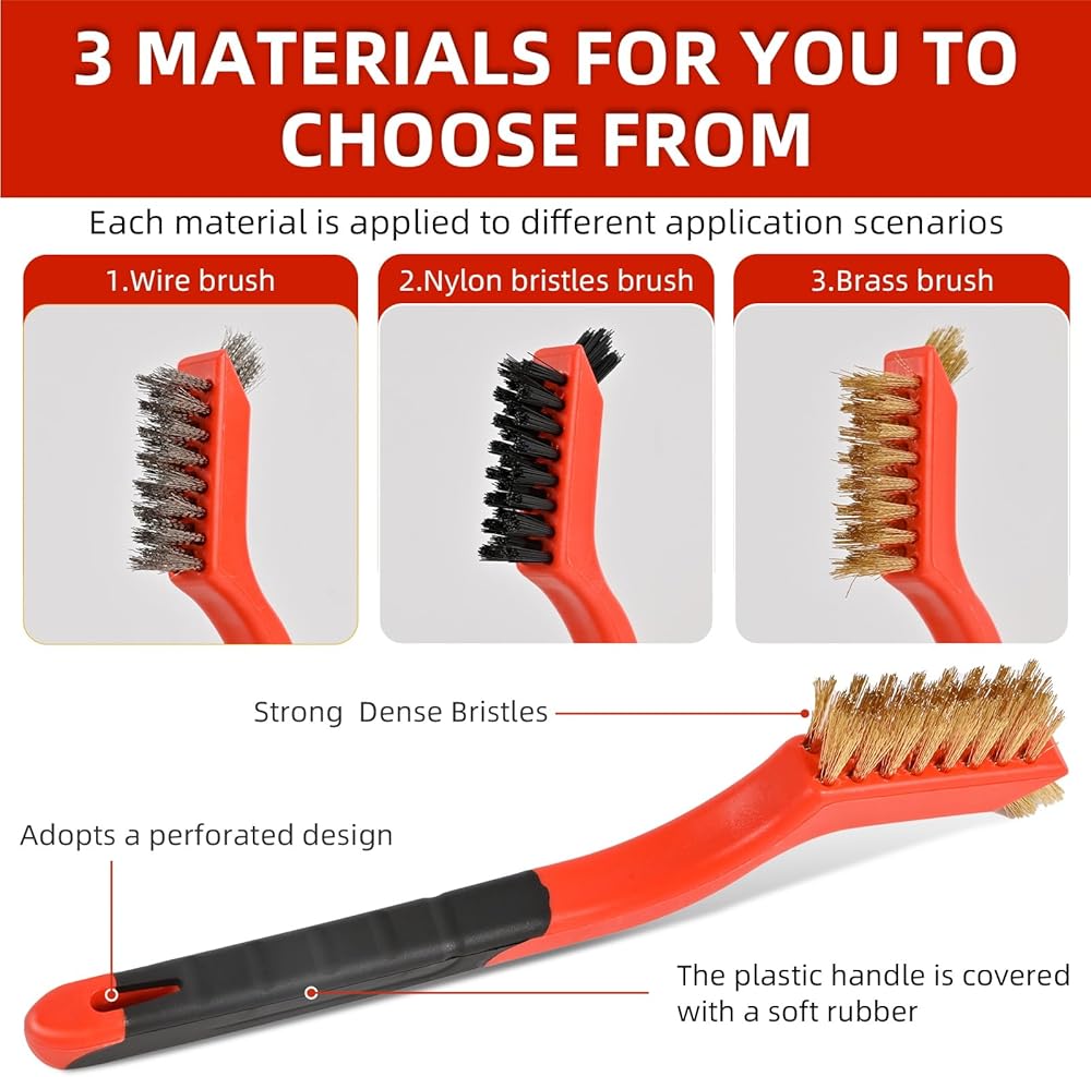 Wide Application: You can use a stainless steel wire brushes for cleaning rust, and a nylon brush is perfect for delicate household appliances. The brass brush is suitable for removing unfinished welds, stains, on metal parts without damaging the surface