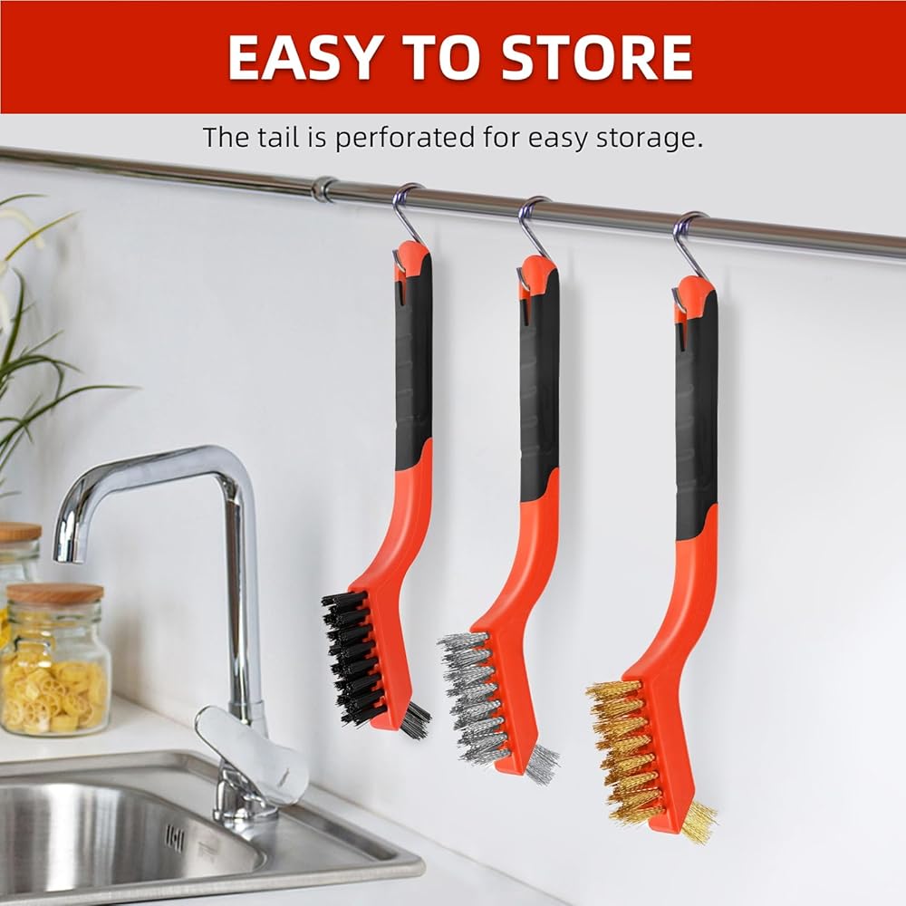 Ergonomic Design: The plastic handle of the small wire brush is covered with a soft rubber layer, and each brush has water chestnut for comfortable grip. Easy to store, the end of the perforated design, easy to organize and store