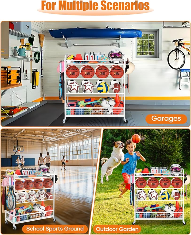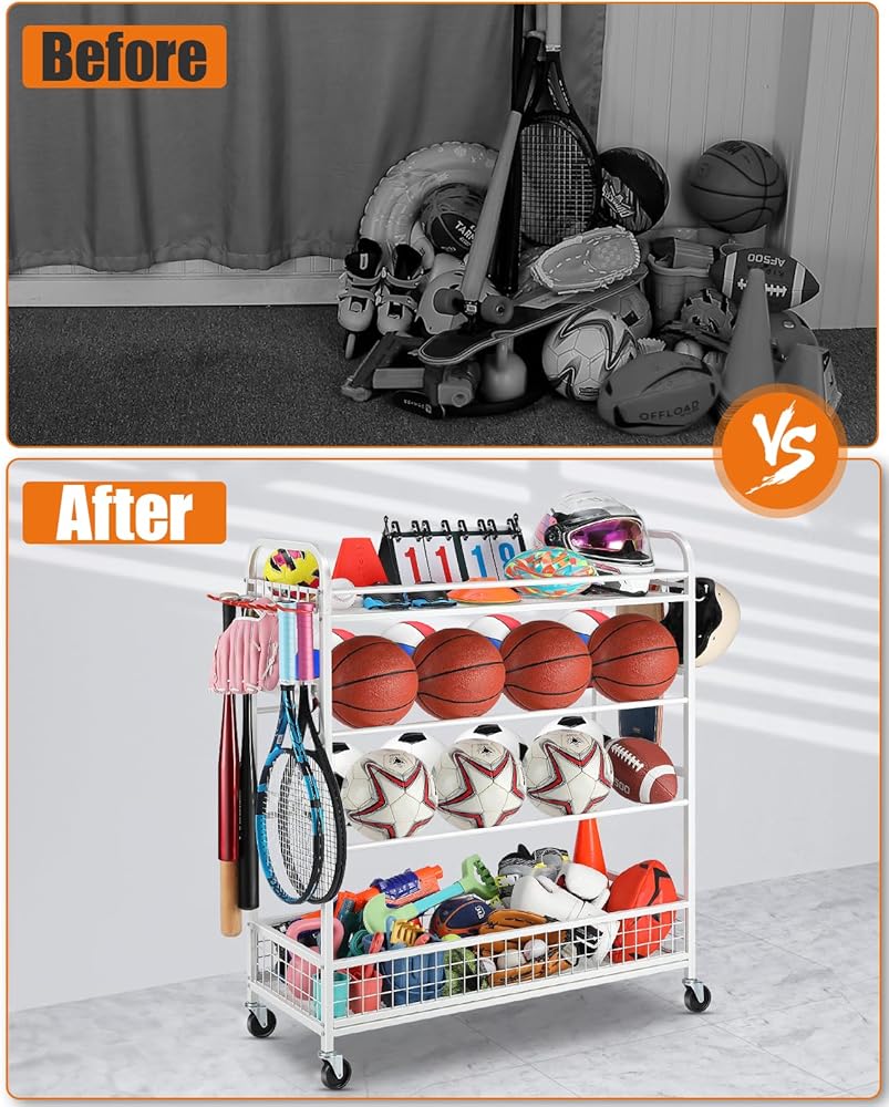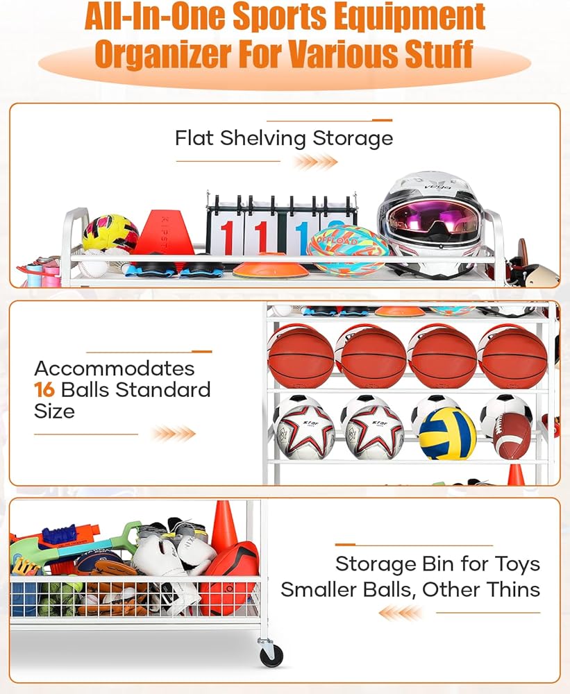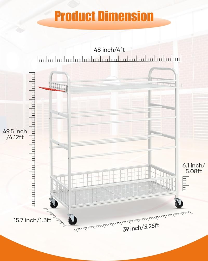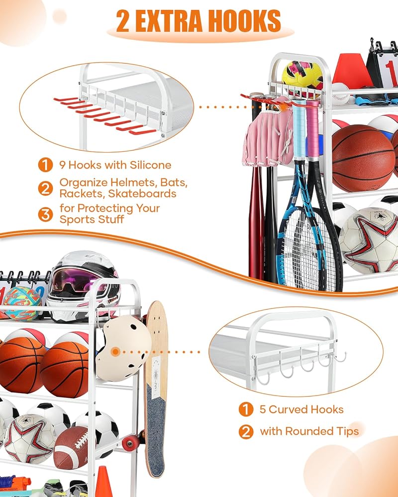 سعة كبيرة للمنظم: يوفر التصميم المكون من 4 طبقات مساحة واسعة للمعدات الرياضية. يتميز برف علوي مسطح وصندوق تخزين للكرات (15.7 × 39 بوصة)، وأنبوبين لحمل الكرات، و14 خطافًا (9 مستقيمة + 5 منحنية)، مما يساعدك على تنظيم المعدات والوصول إليها بسهولة