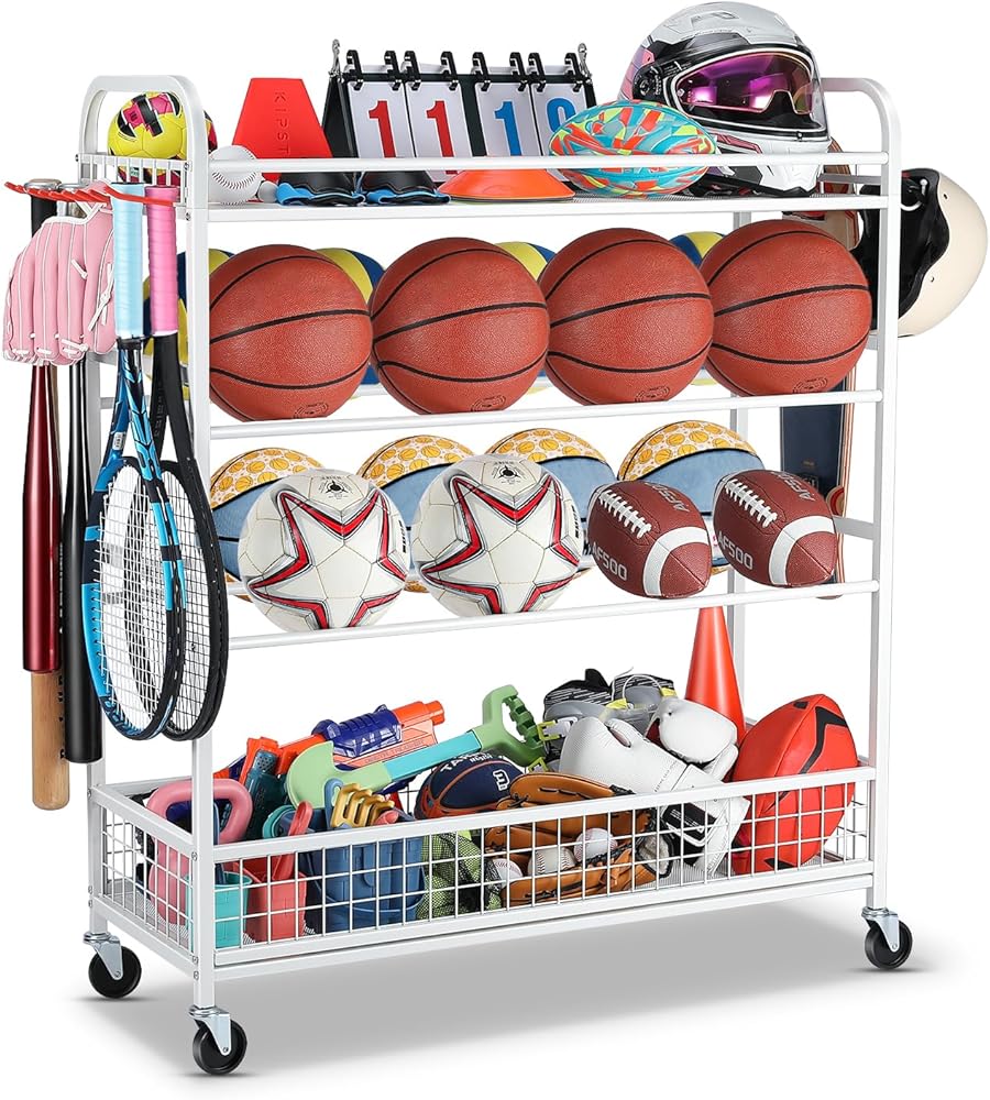 منظم المعدات الرياضية للجراج - صندوق تخزين الكرات الدوارة مع عجلات، رف معدات رياضية للجراج، رفوف كرة السلة الخارجية للكرات مع حامل مضرب البيسبول وخطافات، منظم الألعاب (أبيض)