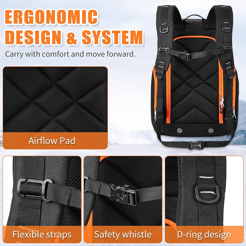 مقاومة للماء ومتينة: أقمشة خارجية قوية تستخدم مزيجًا من القماش المشمع والنايلون 600D، وتتميز بمتانة رائعة للاستخدام لفترة طويلة. حقيبة ظهر مبطنة جيدًا لأحذية التزلج يمكنها حماية أغراضك الهشة. الجزء السفلي من الحقيبة مبطن بالكامل بمشمع مقاوم للماء ومقاوم لدرجات الحرارة المنخفضة، فلا داعي للقلق بشأن نقع الثلج من خلاله.