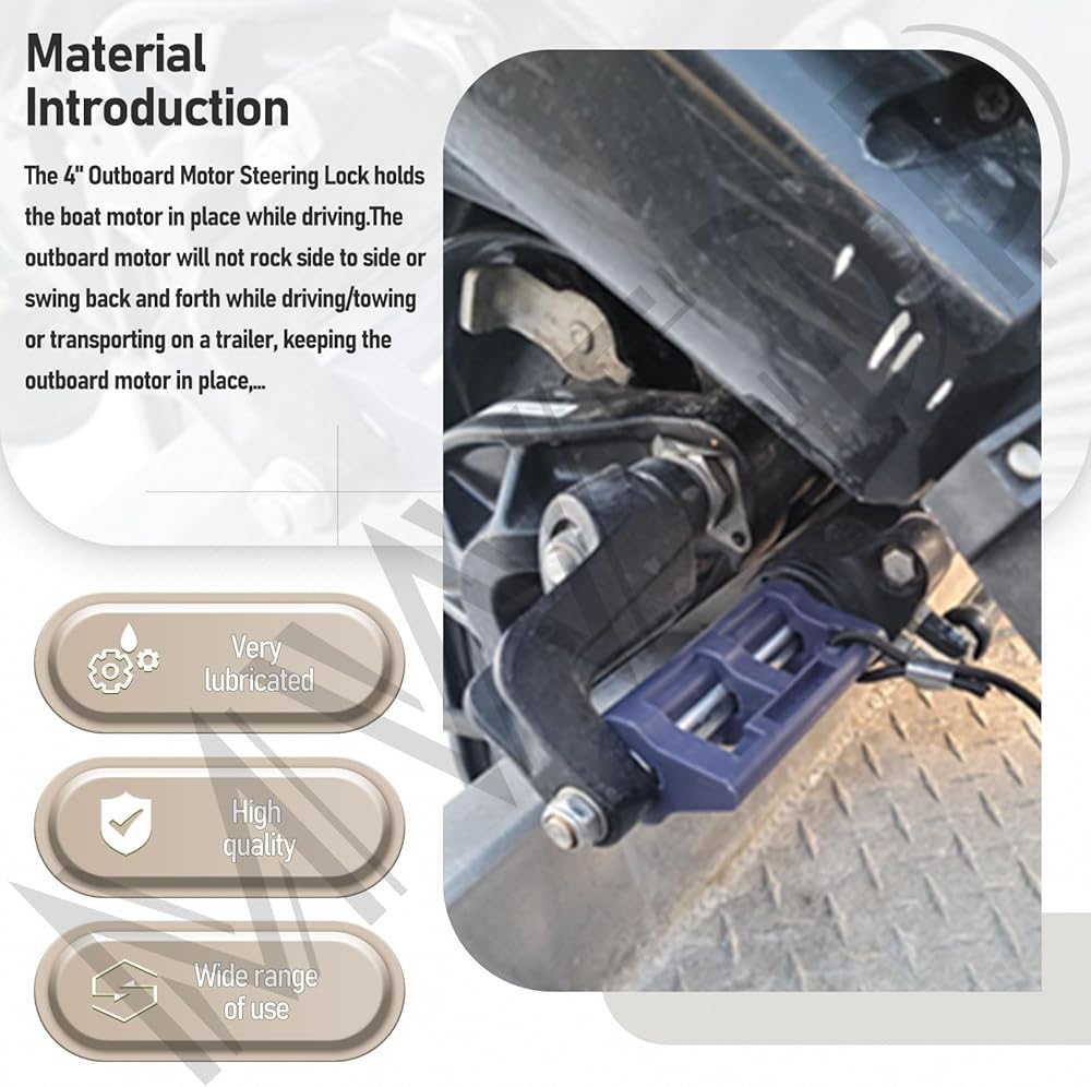 The 4" Outboard Motor Steering Lock holds the boat motor in place while driving. The outboard motor will not rock side to side or swing back and forth while driving/towing or transporting on a trailer, keeping the outboard motor in place.