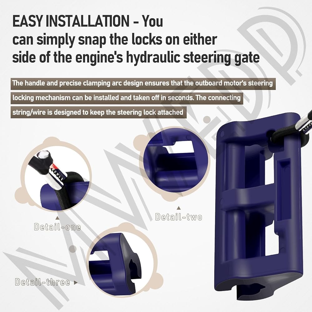 EASY INSTALLATION - You can simply snap the locks on either side of the engine's hydraulic steering gate. The handle and precise clamping arc design ensures that the outboard motor's steering locking mechanism can be installed and taken off in seconds. The connecting string/wire is designed to keep the steering lock attached for easy organization and storage.
