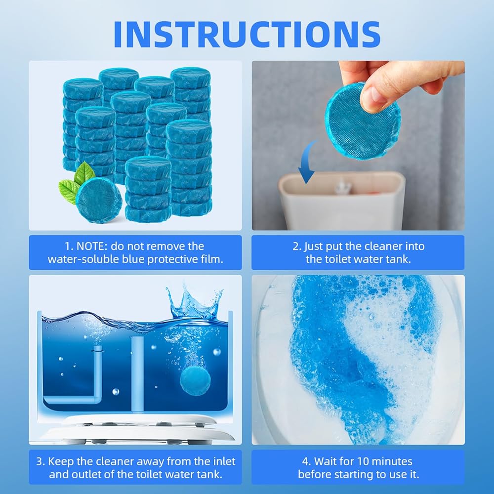الاستخدام السهل: قم بإسقاط قرص منظف المرحاض سريع الذوبان في الخزان (ملاحظة: لا تقم بإزالة الطبقة الواقية الزرقاء القابلة للذوبان في الماء). سوف يذوب، ويطلق العنان لقوة التنظيف. يحافظ الغشاء الواقي على الجهاز اللوحي سليمًا حتى يصبح جاهزًا.
