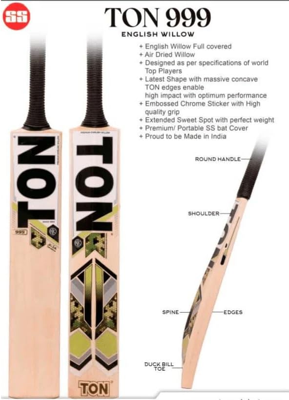 MADE IN INDIA and designed by words best craftsmen, newly launched SS Edition English willow cricket bat SS TON 999 English Willow Cricket bat is made of a prime, hand-picked English willows and are made of bat profile, shape and size that one of greats of cricket, Sachin Tendulkar, have used for more than a decade