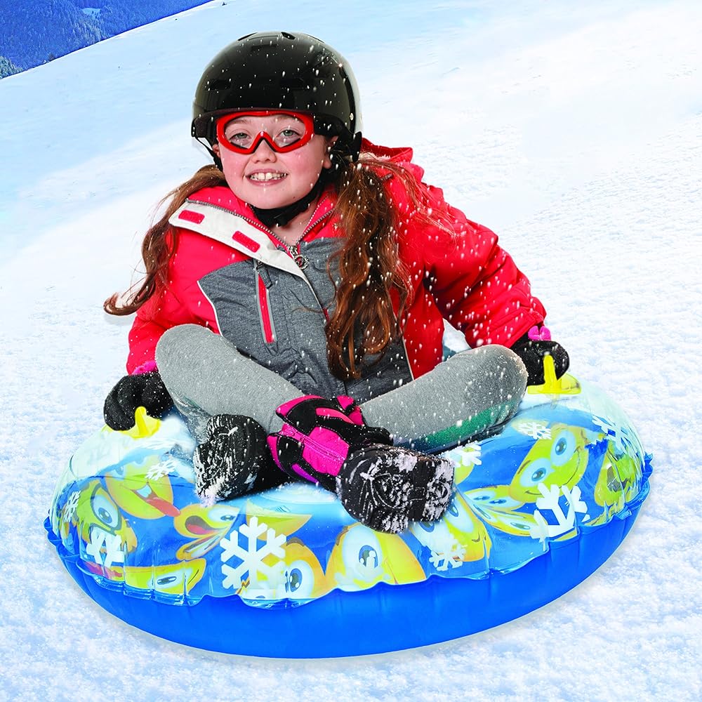 Perfect winter match—snow and plaid! Blast down the hill on the Pipeline Snow 3D Mega Snow-Tube (32” inch diameter) in Emoji Blue/Yellow/Clear White Snowflake print design. This one-person snow tube features 3D Mega graphics, 2 oversized, sturdy handles for added safety and durability. Maximum weight capacity is 120 lbs. • One (1) Person snow tube • Dimensions 32” inch diameter (81 cm) inflated • 3D graphics design in Emoji Blue/Yellow/Clear White Snowflake print design • Two (2) oversized, sturdy grip handles • Maximum weight capacity: 120 lbs. • Recommended ages 4 and up WARNING FOR SNOW: This is not a towable device. Never tow from any vehicle. Never allow diving onto this product. Product develops high speed under certain snow conditions. Product has no brakes and no steering. Avoid obstacles, rough terrain, rocks/stones, tree branches/sticks/twigs and sudden drops. Use of this product and participation in this sport involves the inherent risk of injury or death. Wearing of protective helmet, safety goggles and gloves is highly advised. Never use in proximity to roads, driveways or any area where there is vehicle traffic. Follow these rules to avoid serious injury. Do not use this product on ice or any surface other than snow due to loss of control and maneuverability. Never use for downhill. Do not kneel on product during use. COMMITTED TO CUSTOMER SATISFACTION: LIMITED WARRANTY – Your satisfaction is our ultimate goal. That's why all Pipeline SNO products carry our performance warranty. Product color and graphics may vary from those pictured. For warranty service or more information, email Aqua-Leisure Industries, Inc. at [email protected].