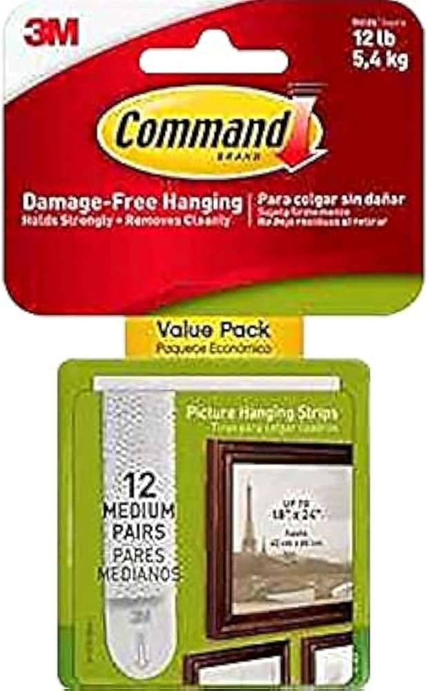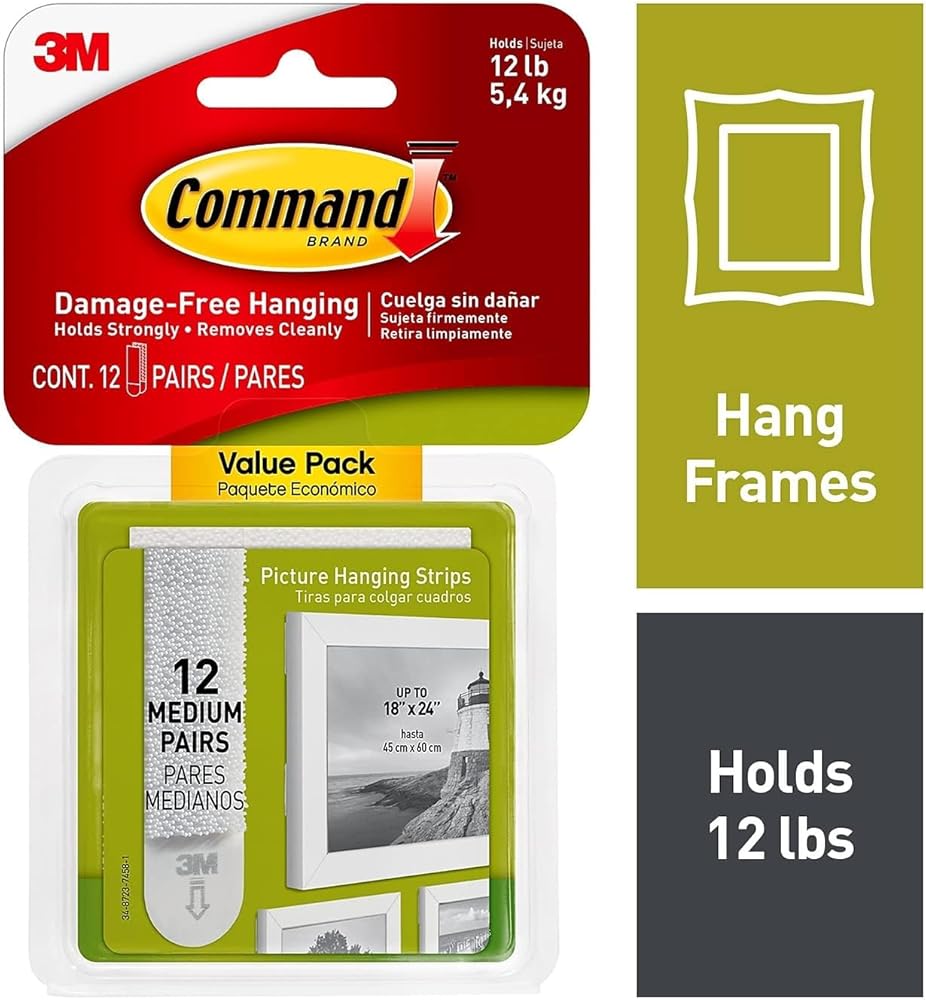 Decorate workstations with this Command medium picture hanging strips value pack. Mount photos on office walls with these picture hanging strips. Featuring advanced adhesive, these picture hanging strips let you hang photos or certificates on most walls without tools. The 24 included strips in this Command medium picture hanging strips value pack are easy to remove without damaging paint or leaving residue. Picture hanging strip for mounting photos, posters, artwork, or papers. Capable of holding up to 3 lbs. of weight. Product comes in medium size. Comes in white and made of foam. 12 strips per pack.