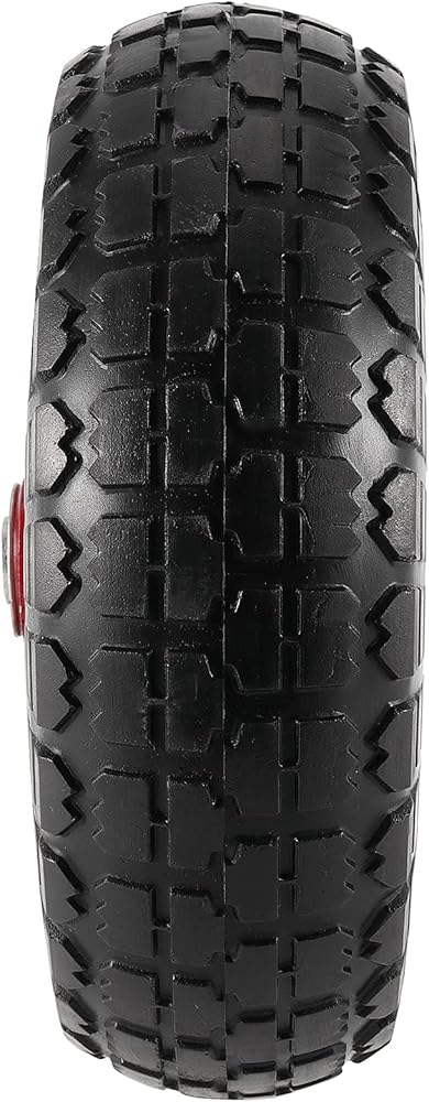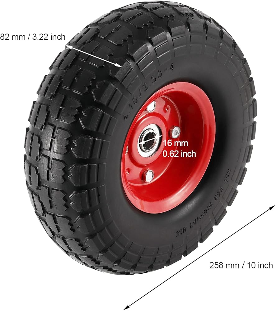 • 【GOOD WEAR RESISTANCE】 Made of high-quality polyurethane filled with hardened foam, the tire thread type is 4.10/3.50-4, and the center red hub is made of heavy iron. You can count on the durability of the solid rubber replacement tires to provide long-term use!