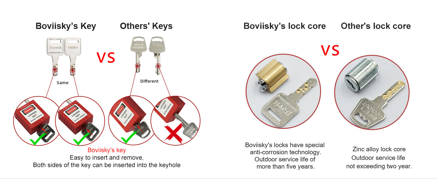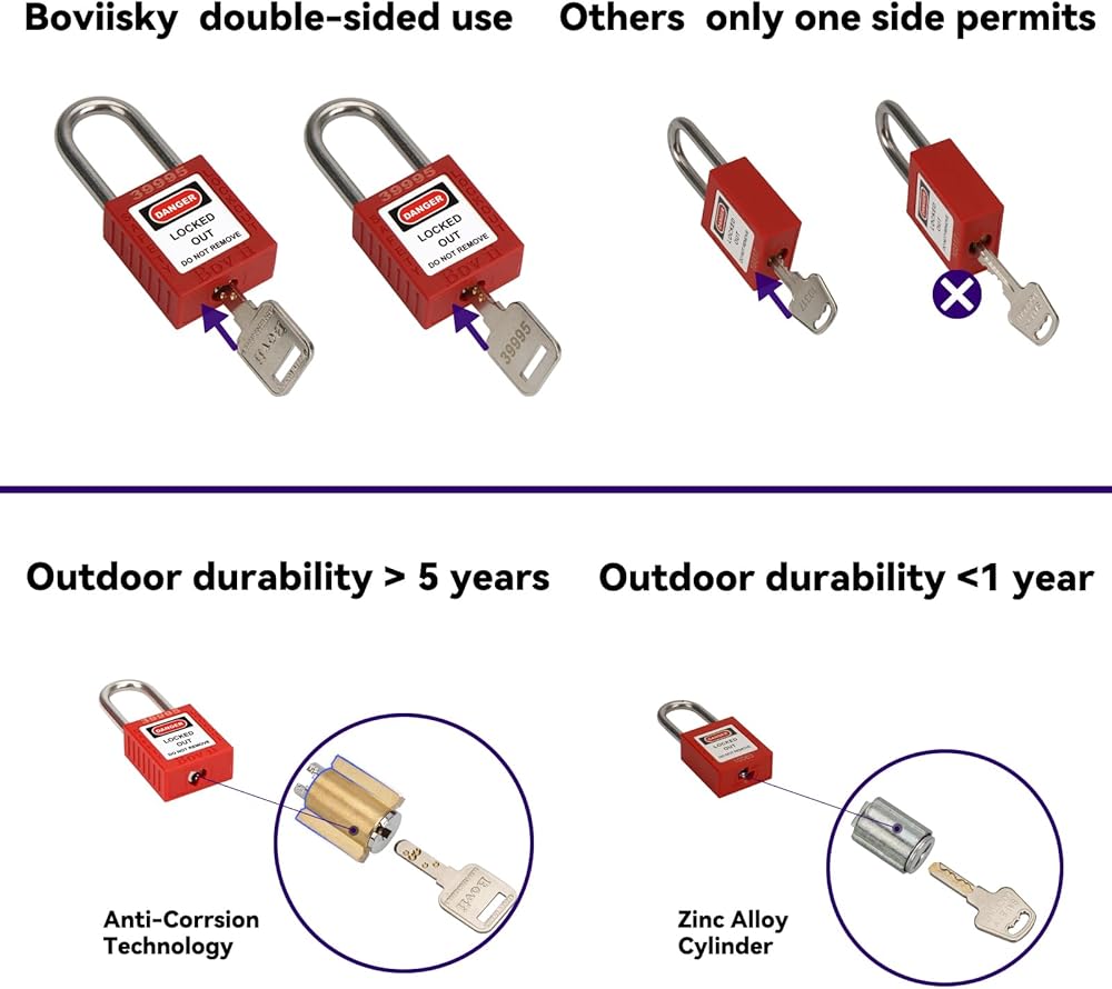 أقفال Tagout Lockout: 4 أسطوانات قفل حمراء مصنوعة من النحاس، والتي يمكن أن تحقق نظام إدارة من 6 مستويات، مع تصميم تصريف ومضاد للتآكل، ومواد الغلاف مقاومة للأحماض والقلويات، مع عمر خدمة طويل؛ يمكن إدخال المفتاح على كلا الجانبين، والقفل به شرائط مضادة للانزلاق على كلا الجانبين. ويمكن أيضًا استخدام القفازات بكفاءة؛ القفل غير ناجح ولا يمكن إزالة المفتاح، مما يمكن أن يمنع بشكل فعال فقدان المفتاح وفشل القفل.