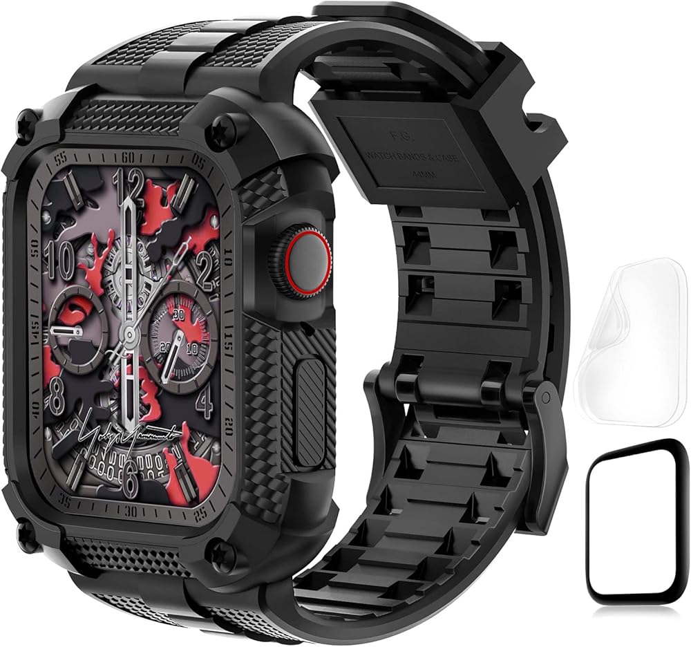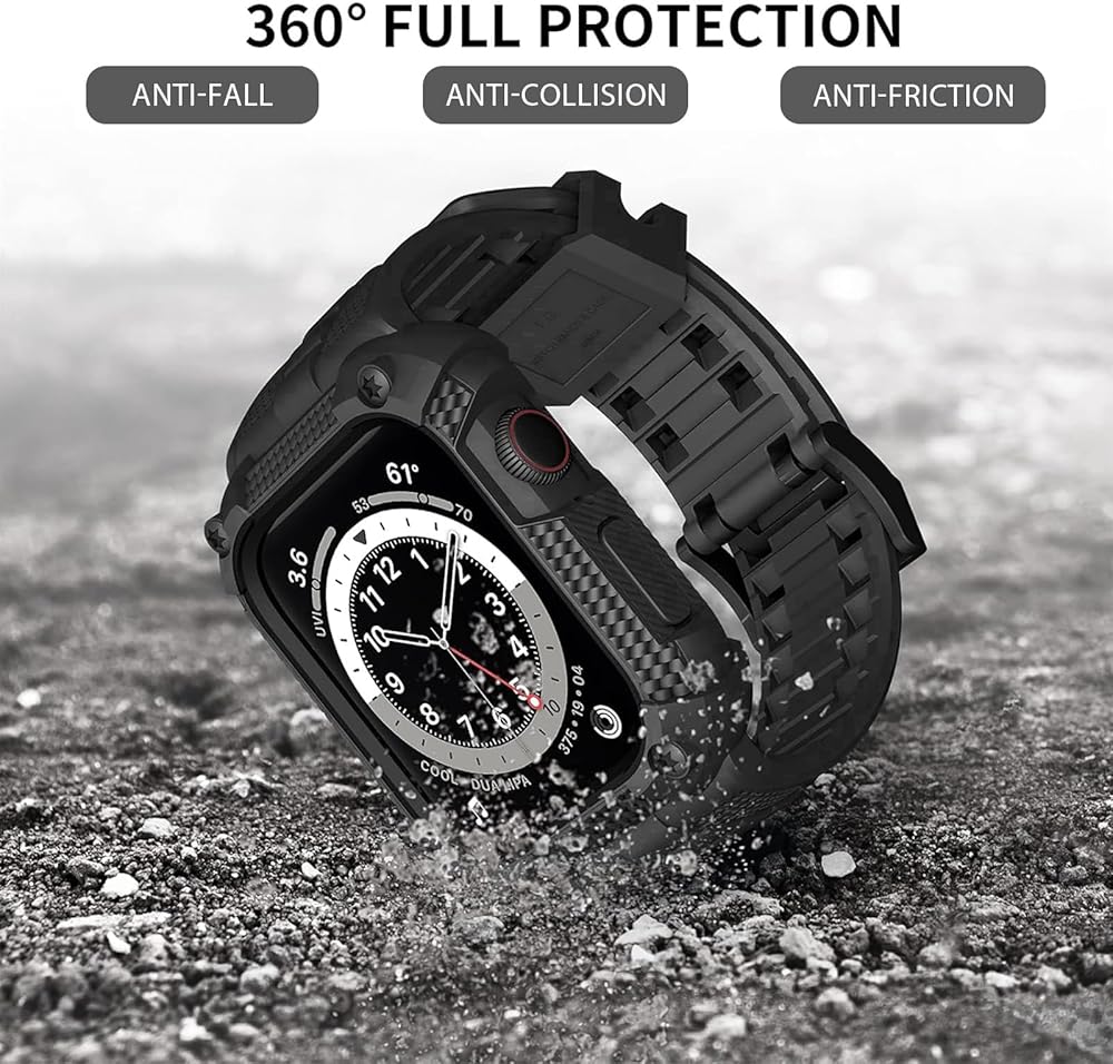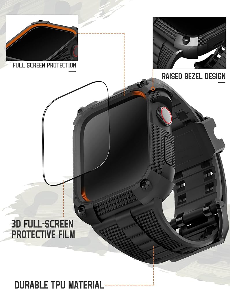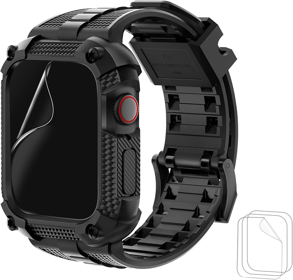 متوافق مع سوار ساعة Apple مع حافظة متينة مقاومة للصدمات مقاس 40 مم 41 مم 44 مم 45 مم لسلسلة iWatch 9/8/7/6/SE/5/4، حزام رياضي متين من مادة TPU مع واقي شاشة تغطية كاملة، 44 مم