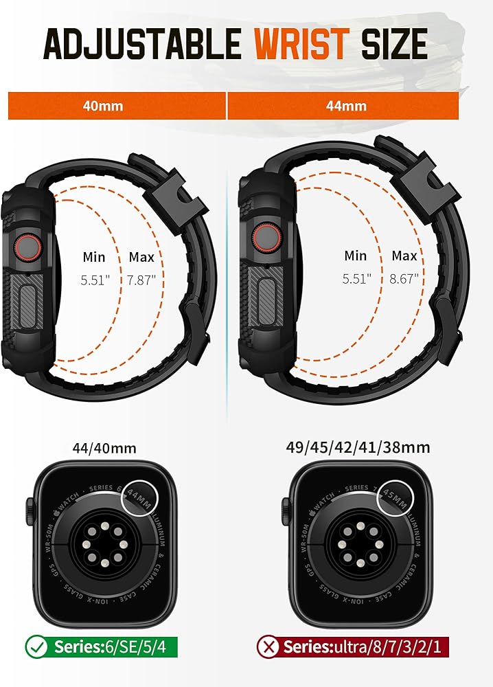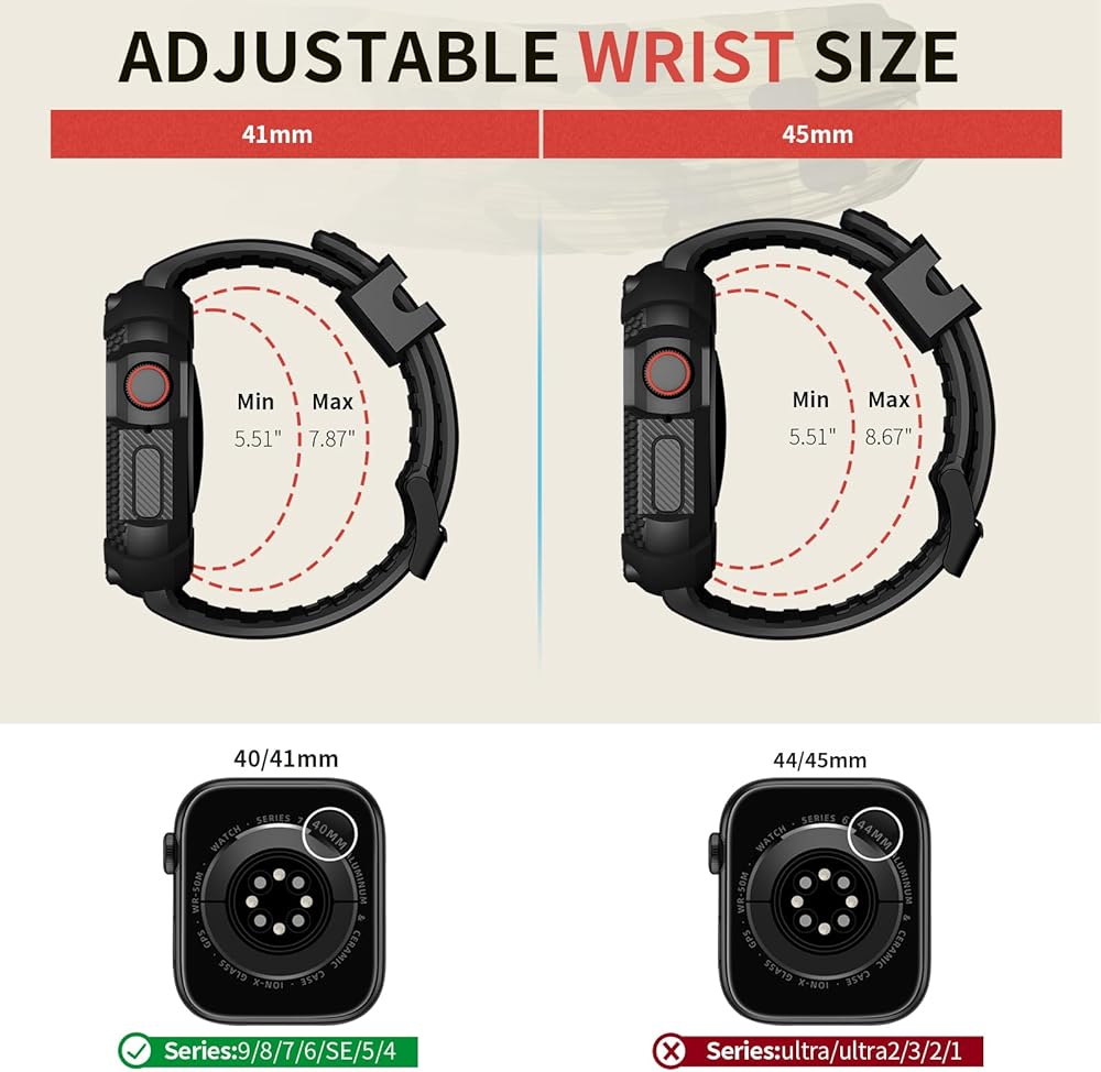 حزام ساعة رياضي قابل للتعديل: فتحات هواء مزدوجة تجعلها أكثر مسامية وقابلة للتعديل، مما يحافظ على برودة معصمك. تصميم إنساني يناسب معظم المعصم بشكل مثالي مع سلسلة ساعات Apple 8/7/6/SE/5/4. سوار الساعة الذكية 40/41 ملم يناسب مقاس المعصم 5.51 بوصة - 7.87 بوصة (139 ملم - 200 ملم). سوار iWatch من السيليكون مقاس 44/45 مم يناسب مقاس المعصم من 5.51 بوصة - 8.67 بوصة (139 مم - 220 مم).