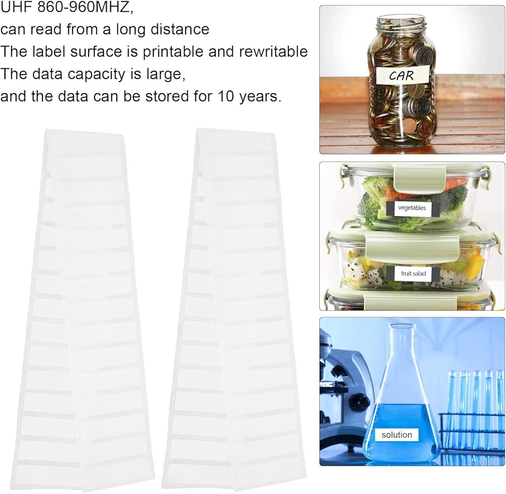 ULTRA LABELS: UHF 860‑960MHZ labels, a total of 100 pieces with about 73x20mm size, long distance can be read quickly, larger storage capacity.