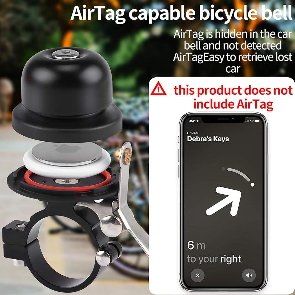 --From now on, you no longer have to worry about your expensive and beloved bike being stolen! Have you ever lost your bike? Or forgotten where your bike is? With the AirTag bike bell, you will no longer have this trouble. Attach AirTag to your bike for optimal monitoring and use AirTag's extensive features to track your bike. (DOES NOT INCLUDE AIRTAG)