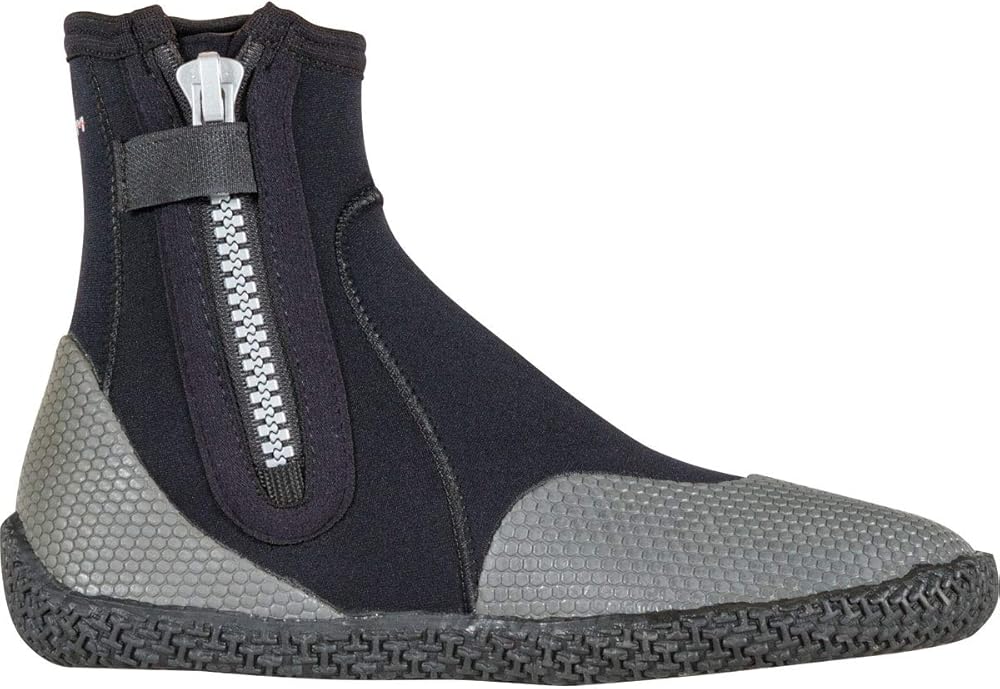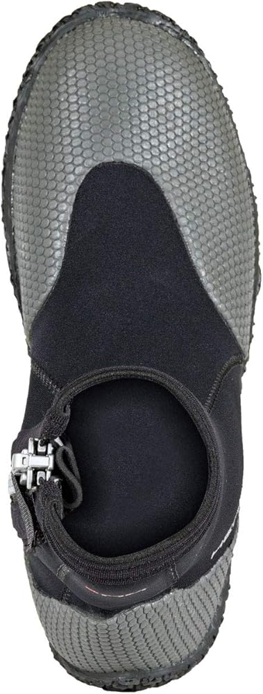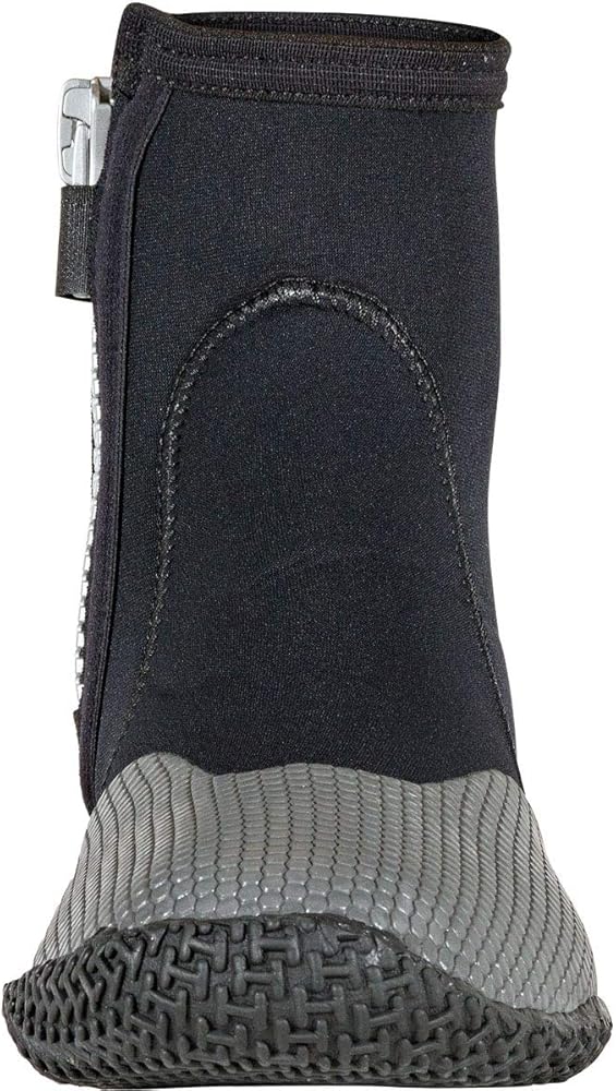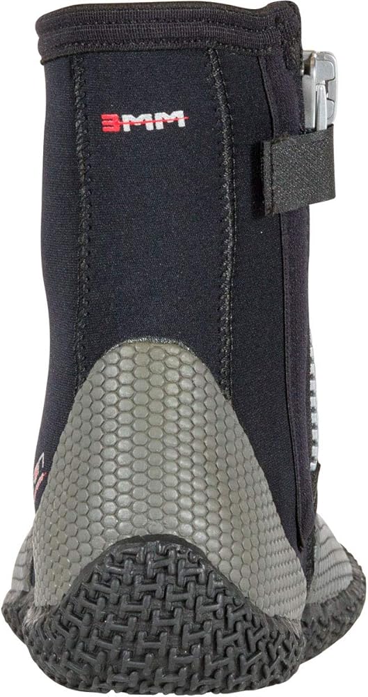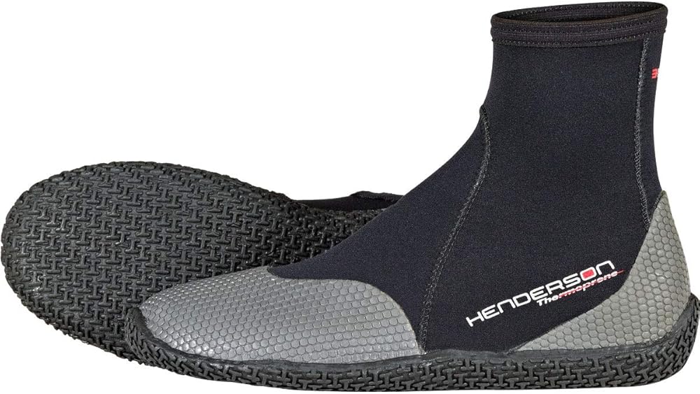 Divers seeking a great value will appreciate Thermoprene's balance of performance and price. The material combination delivers greater flexibility and improved features not found in standard neoprene wetsuits, yet at a reasonable cost, perfect for the cost-conscious buyer. Thermoprene is crafted from a high-quality neoprene and a low pill fabric. It has 75% more stretch than standard neoprene, so while it is not as flexible as Henderson's Thermoprene Pro or TherMAXX lines of products, it still boasts significant comfort characteristics. The 180° stretch Thermoprene is noticeably easy to don, pulling over the feet with less huff and puff than standard boots. Also, the fabric's exterior stands up extremely well to the wear of fin straps and foot pockets with its pill/abrasion-resistant exterior laminate. The Thermoprene boot line from Henderson Aquatics delivers quality and performance a step above the rest. A fantastic value. Get the features and design benefits of more expensive boots in this economically priced boot ideal for both local waters and exotic destinations. The Henderson Thermoprene High-Top Boot has a durable traction sole, glued and sewn seams, heavy duty abrasion resistant thread, and a puncture resistant sole. These 3mm nylon 2 neoprene boots come equipped with a #10 heavy-duty zipper closure and Water Entry Barrier (WEB) for added comfort and warmth. A hook and loop fastener keeps the zipper in full up position while finning. Boots are black in color