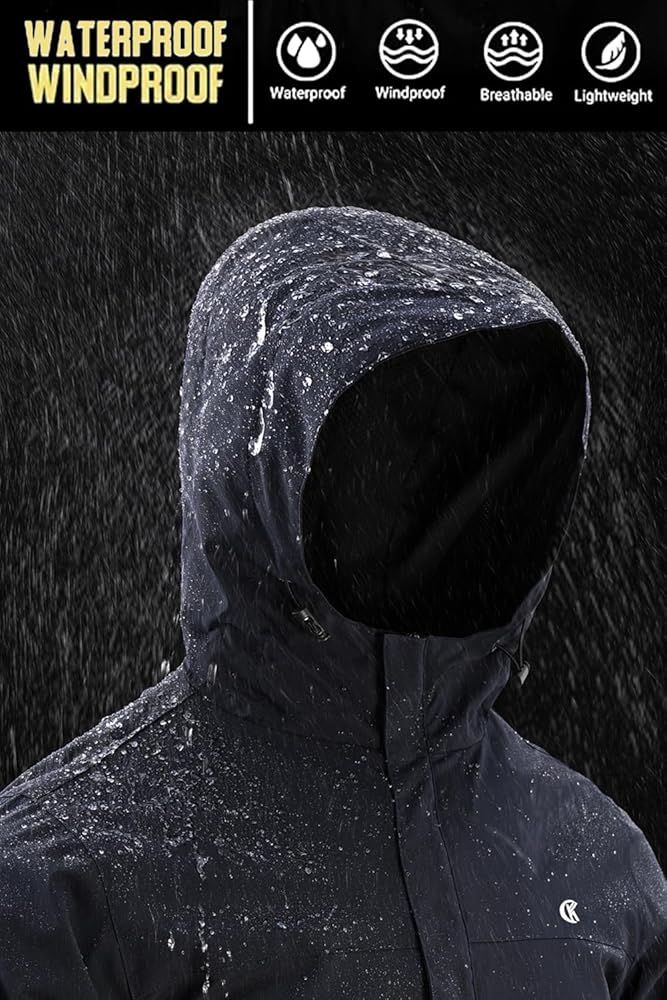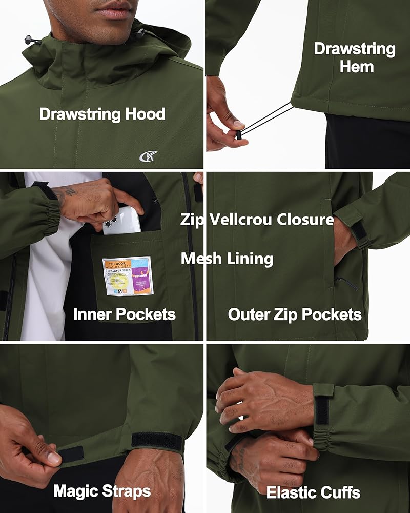 المواد: مصنوعة من نسيج احترافي مقاوم للماء والرياح ومواد طلاء TPU بدرجة احترافية، يمكن لسترة المطر الرجالية هذه أن تمنع اختراق الرطوبة بشكل فعال وتحمي أيضًا من الرياح.