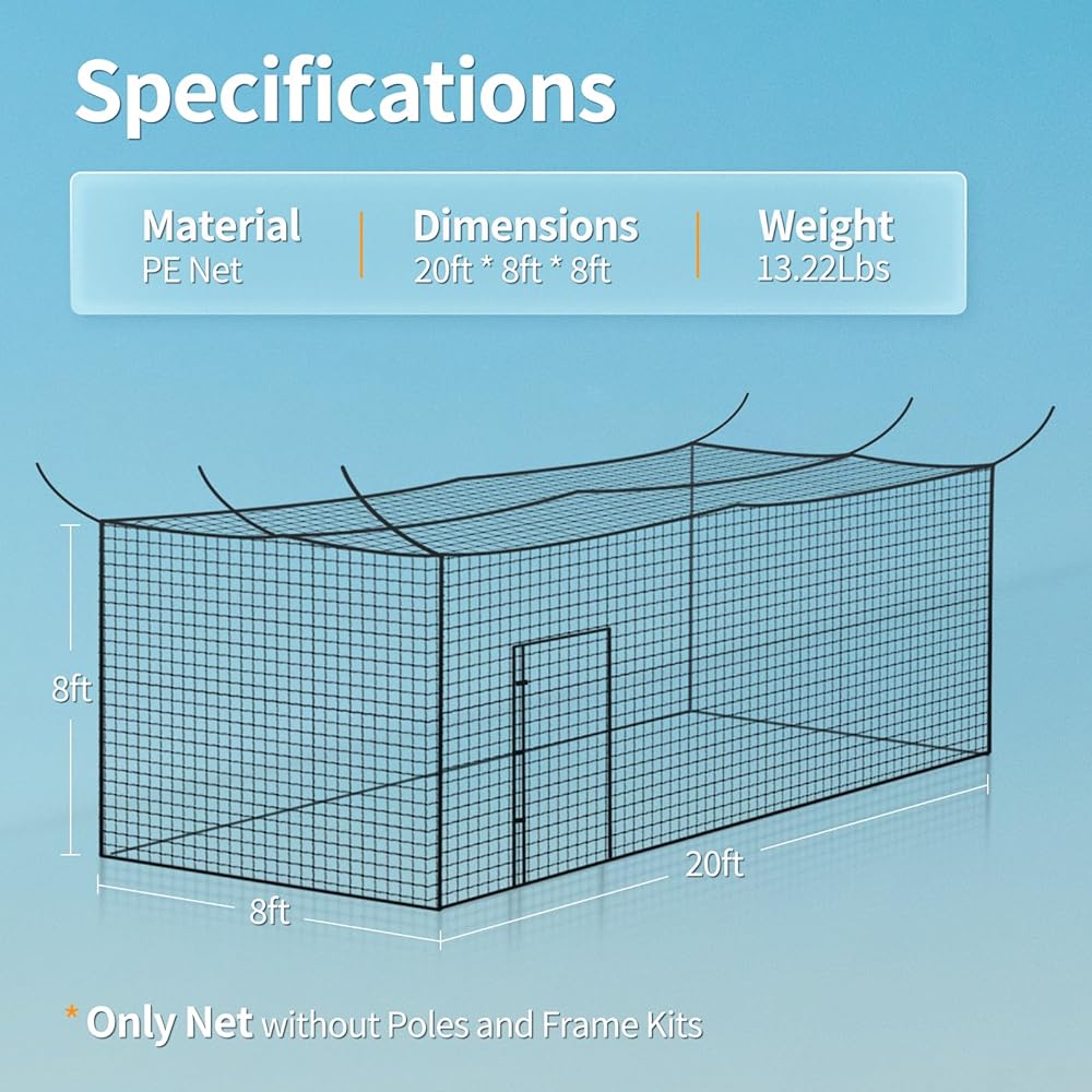 NET ONLY -- Our product only includes the net, if you need other accessories (such as poles and hooks), please purchase them by yourself. The size of this net is 20x8x8FT, please measure your space to see if it fits before purchasing for better use.