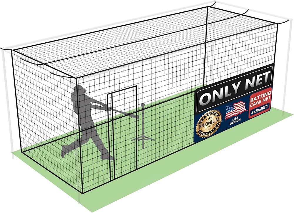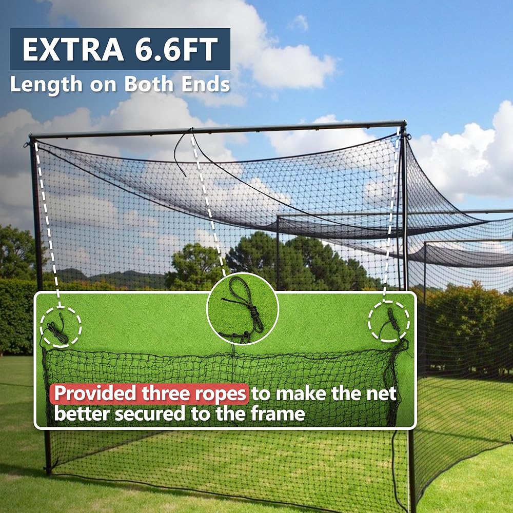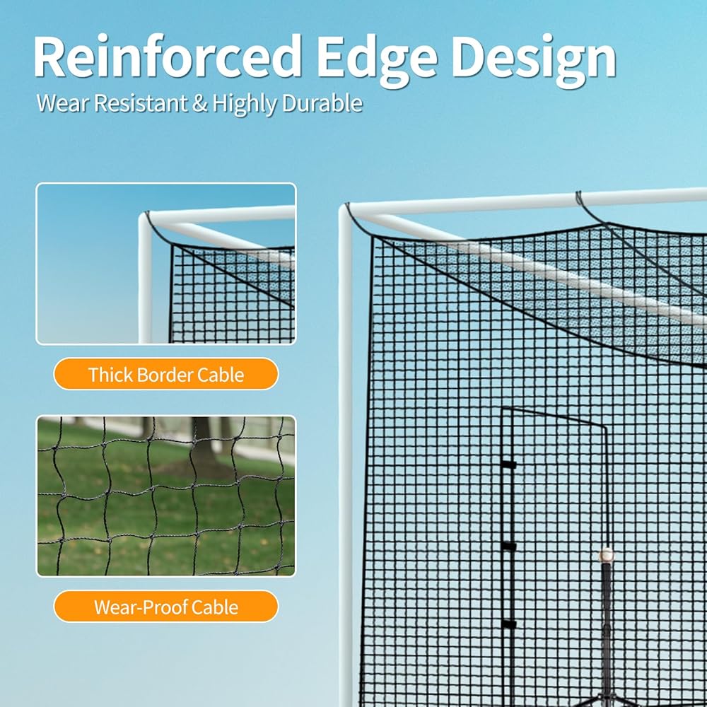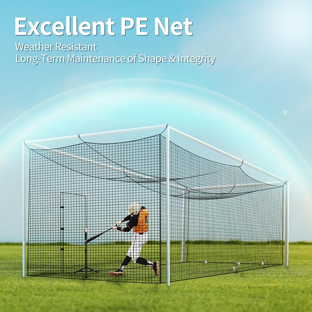 PREMIUM PE NETS -- This batting cage net is made of premium PE material, which is great for intercepting baseballs. The batting cage netting is UV stabilized, making it ideal for indoor and outdoor use. Its reinforced edges are designed to prevent fraying and will maintain its shape and integrity over time. You can use it at home, backyard, school and stadium.