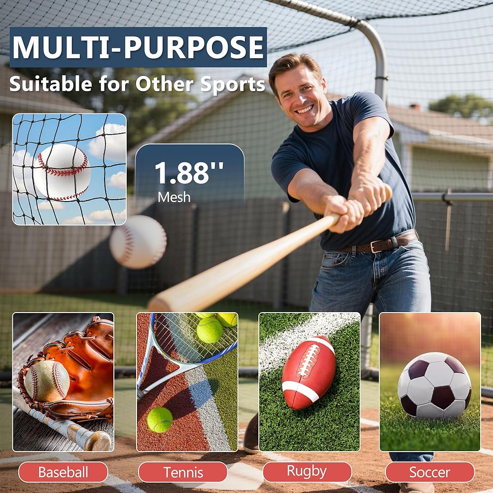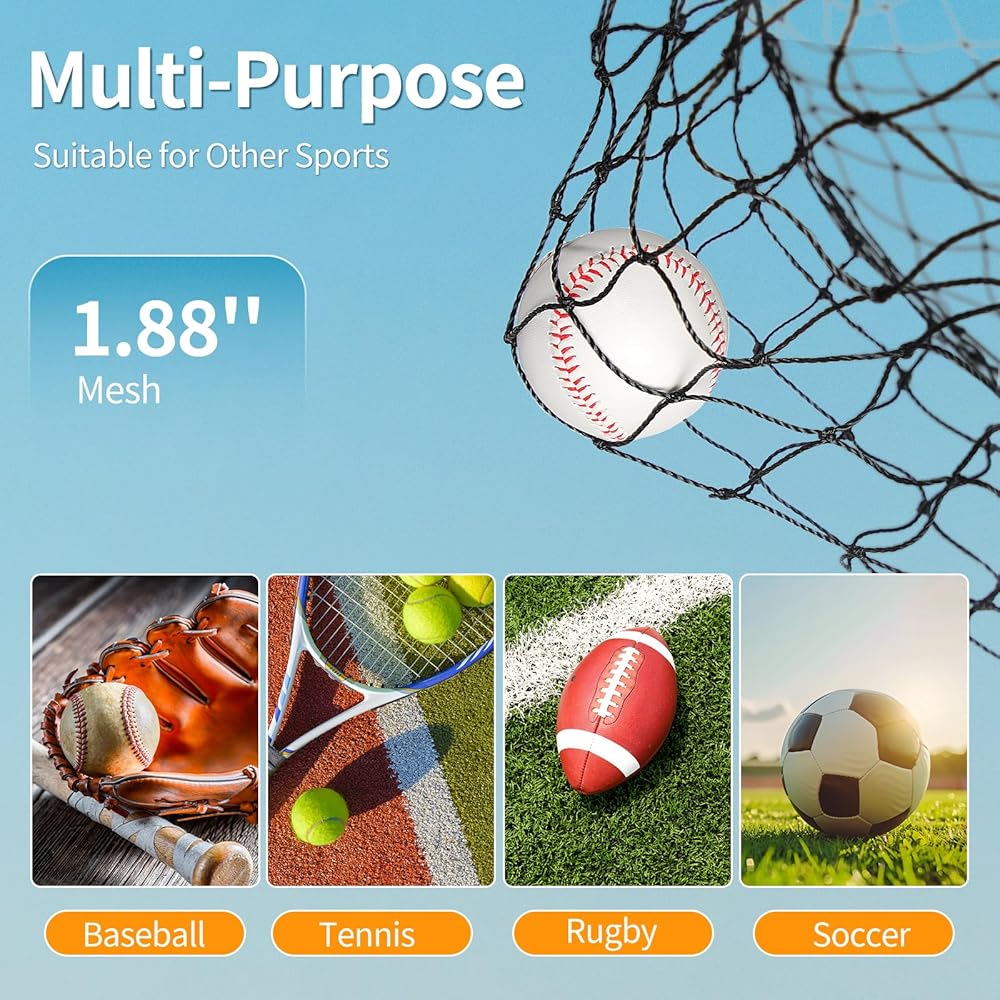 MULTIPURPOSE -- The mesh of the baseball batting cage is 1.88 inches. It can be used for baseball, softball, soccer and many other sports, you can use it according to your needs. The design of the knotted net greatly enhances the impact strength of the net, so you can practice with confidence, allowing you to avoid picking up the ball frequently and improve your skills more efficiently.
