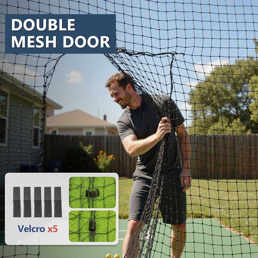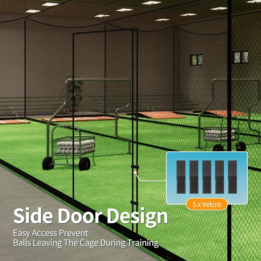 SIDE DOOR DESIGN -- Our baseball batting net is designed with side opening door(78.7" H and 31.5"W), easy to get in and out, providing enough convenience for your training. Naturally sagging and closing when not in use also prevents balls from flying out of the cage during training. If you don't need the door or or want to close it securely, you can use it with the included 5 velcro straps.