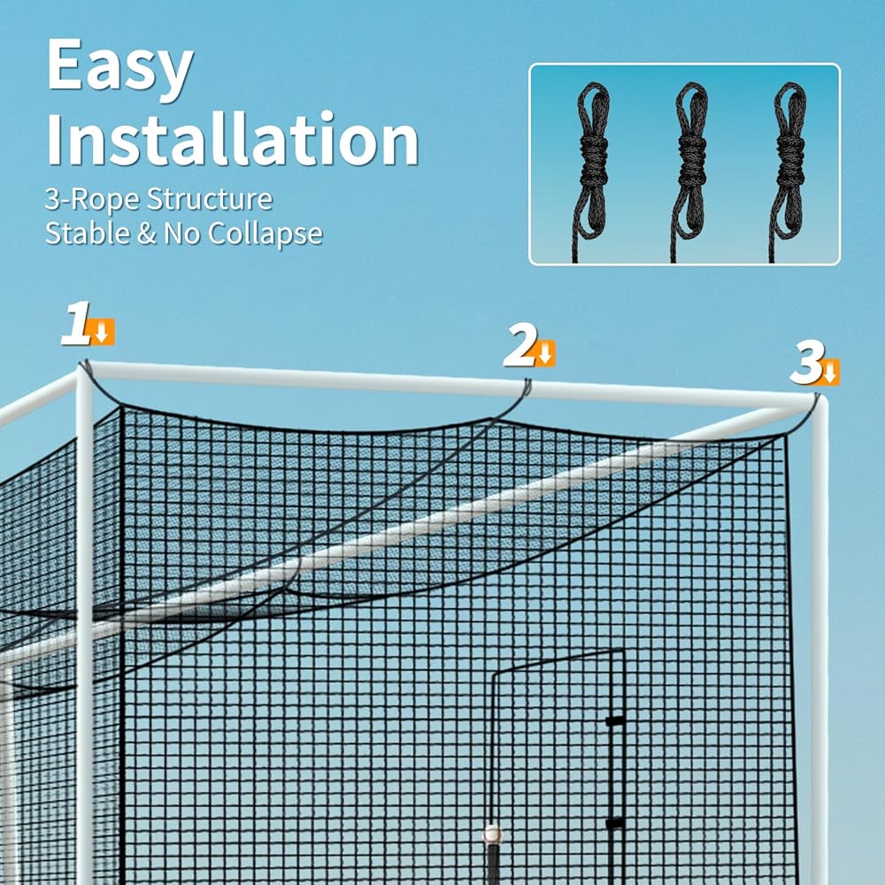 EASY INSTALLATION --The simple one-piece design baseball nets for batting simplify assembly and come with clear installation instructions. We provide three pull ropes that is long enough for you to hang them from fixed hooks on the wall, or from eaves or branches, etc., to help you better set up and take down.