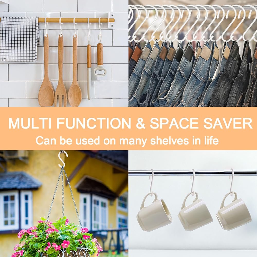 Widely Application: These closet s hooks are great for hanging your plants ,clothes, jeans, scarves, hats, belts, jewelry,purse and more; you could also use heavy duty s hooks for hanging pots,pans,spatulas, and other kitchen utensil on your pot rack, rails or shelves.also useful to hang toiletries, towels and robes in the bathroom, and organize tools in the garage, and hang plants in your garden.