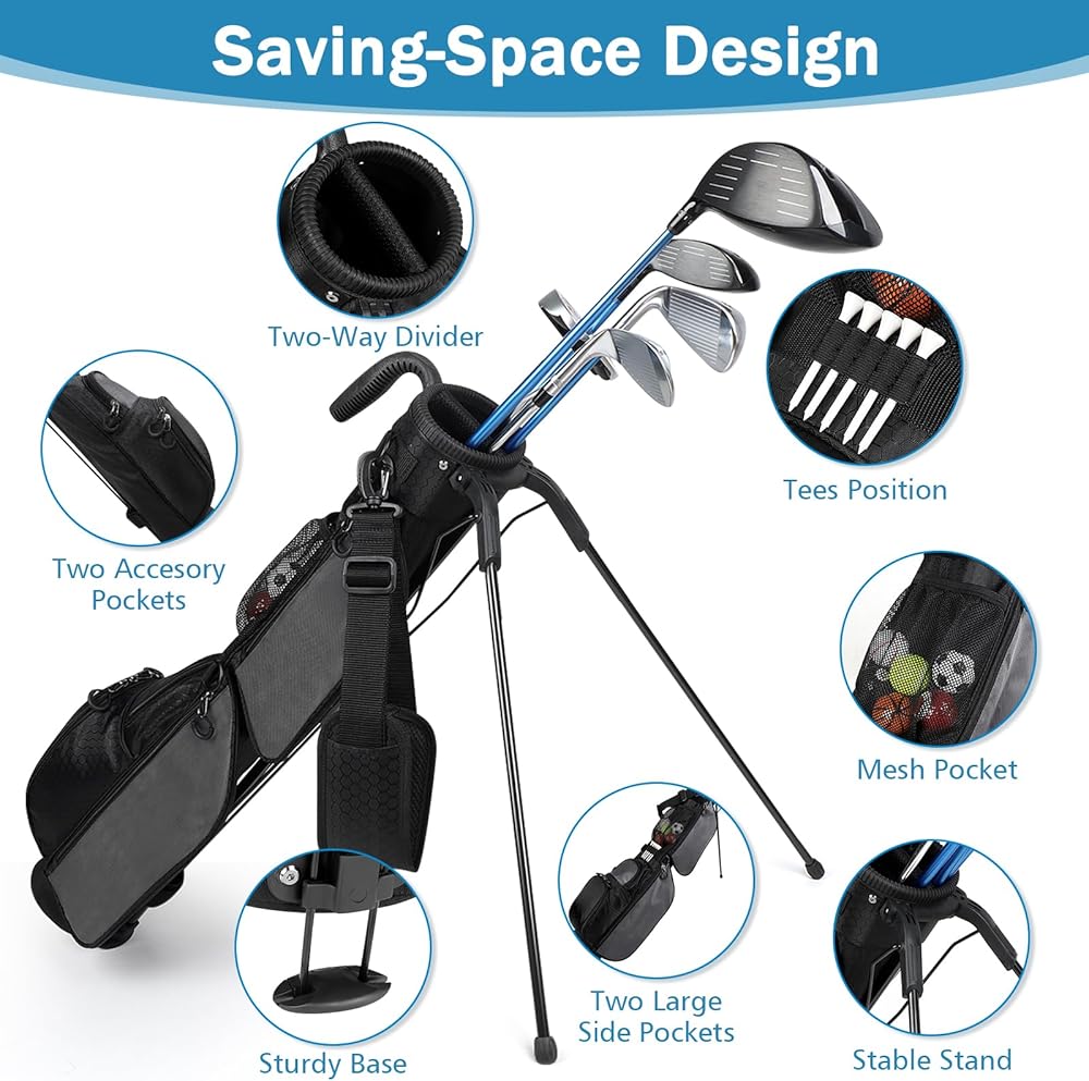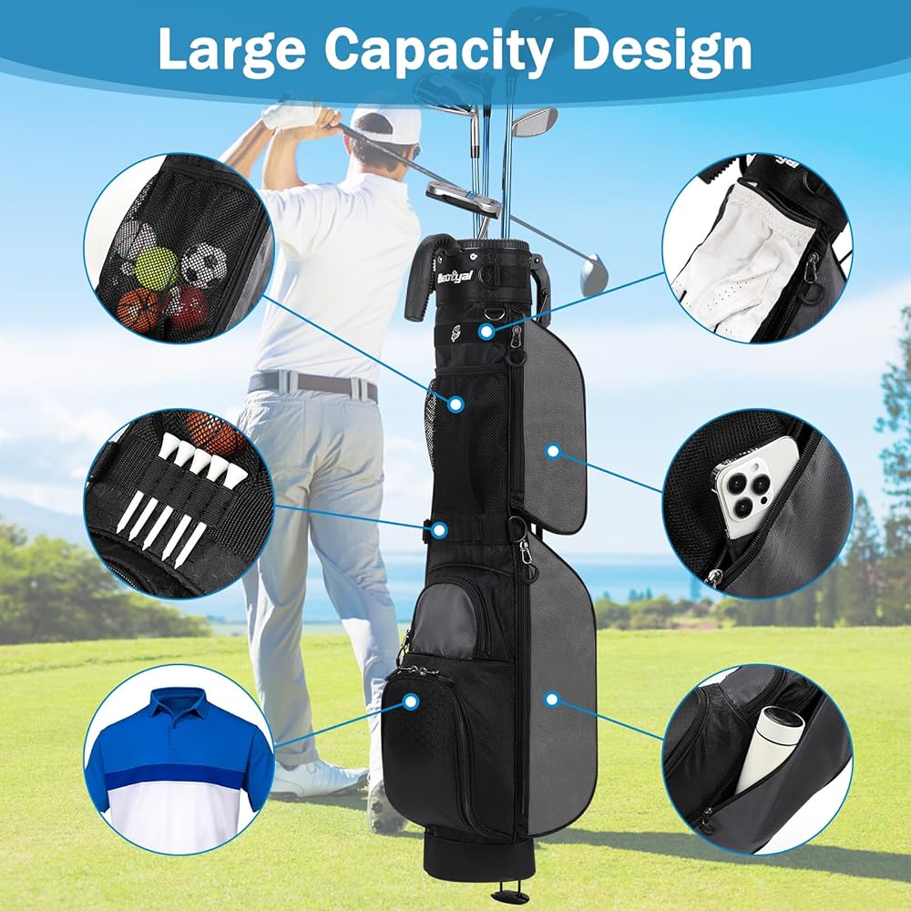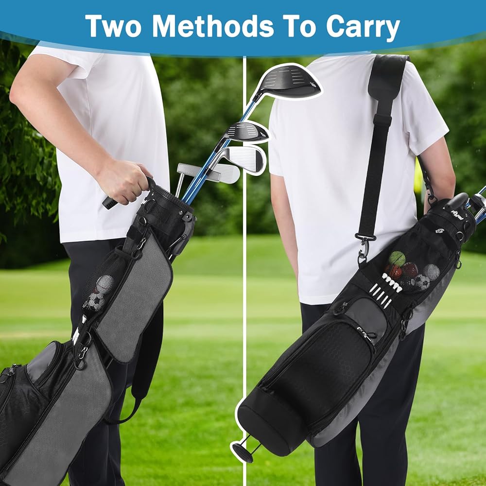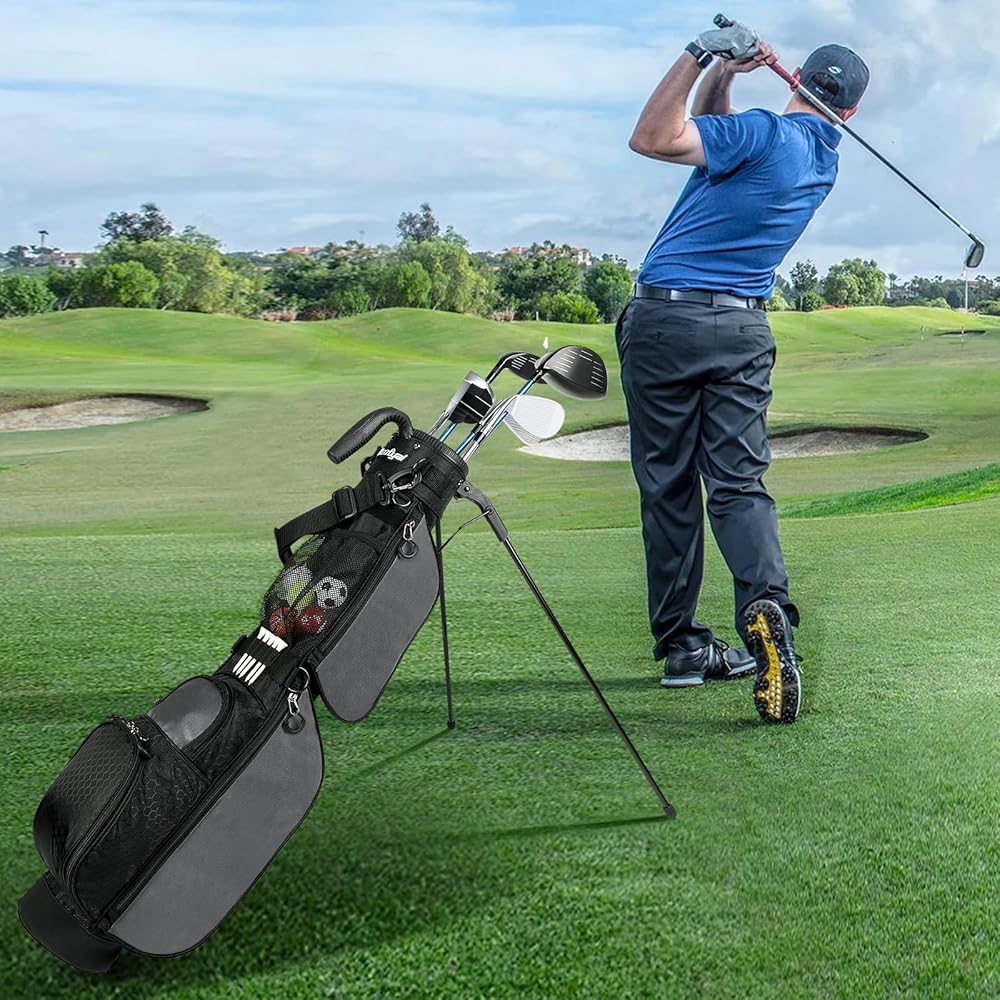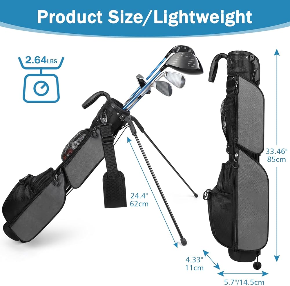 Lightweight Design: This golf stand bag is 33.46" x 5.7" x 4.33" size and just only 2.64 pounds, can holds up to 7 clubs and features a reinforced bottom for increased durability. Perfect golf bag for men and women. Your go-to bag for any golf course that doesn't require all your sticks.