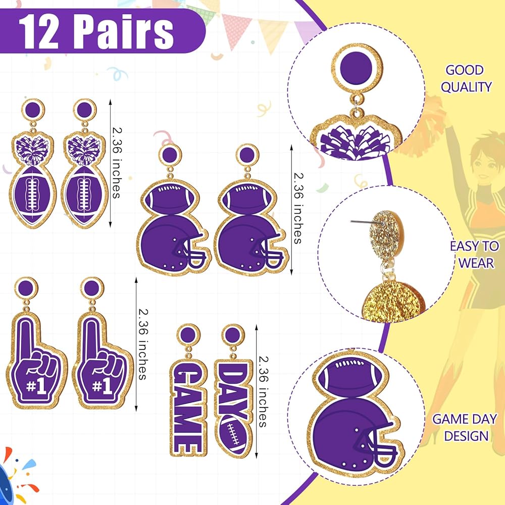 مزيج غني: سوف تحصل على 12 زوجًا من أقراط كرة القدم، كمية كافية لتلبية بديلك اليومي وتشجيع فريقك خلال يوم مباراة العودة للوطن، هناك 4 تصميمات مختلفة، 3 أزواج لكل منها، تشمل الخوذات وكرات القدم والأصابع الإسفنجية و"اللعبة" "يوم" يضيف الطاقة إلى أي جماعة