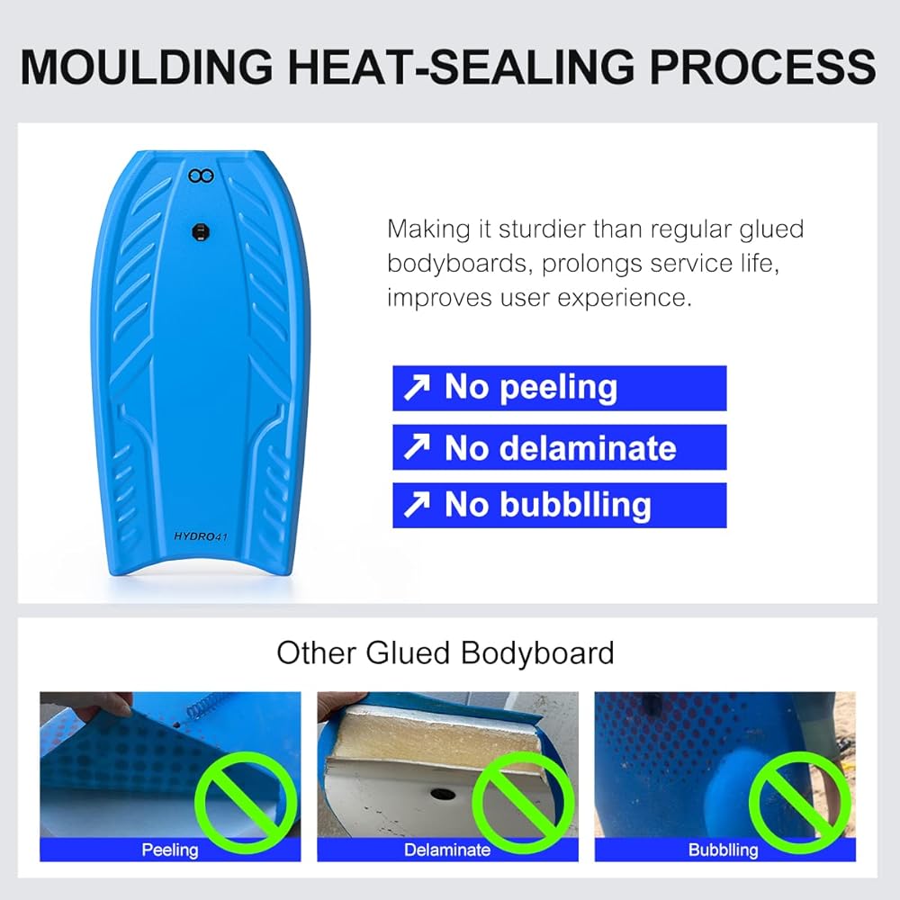 No Peeling No Bubblling Bodyboard: Quality bodyboard is made with high-density foam core that moulded heat-sealed to prevent delamination, make it sturdier than regular glued bodyboards, not easily peel, greatly reduces the problem of blistering of body board. Choose us to ensure your bodyboard will last and perform well